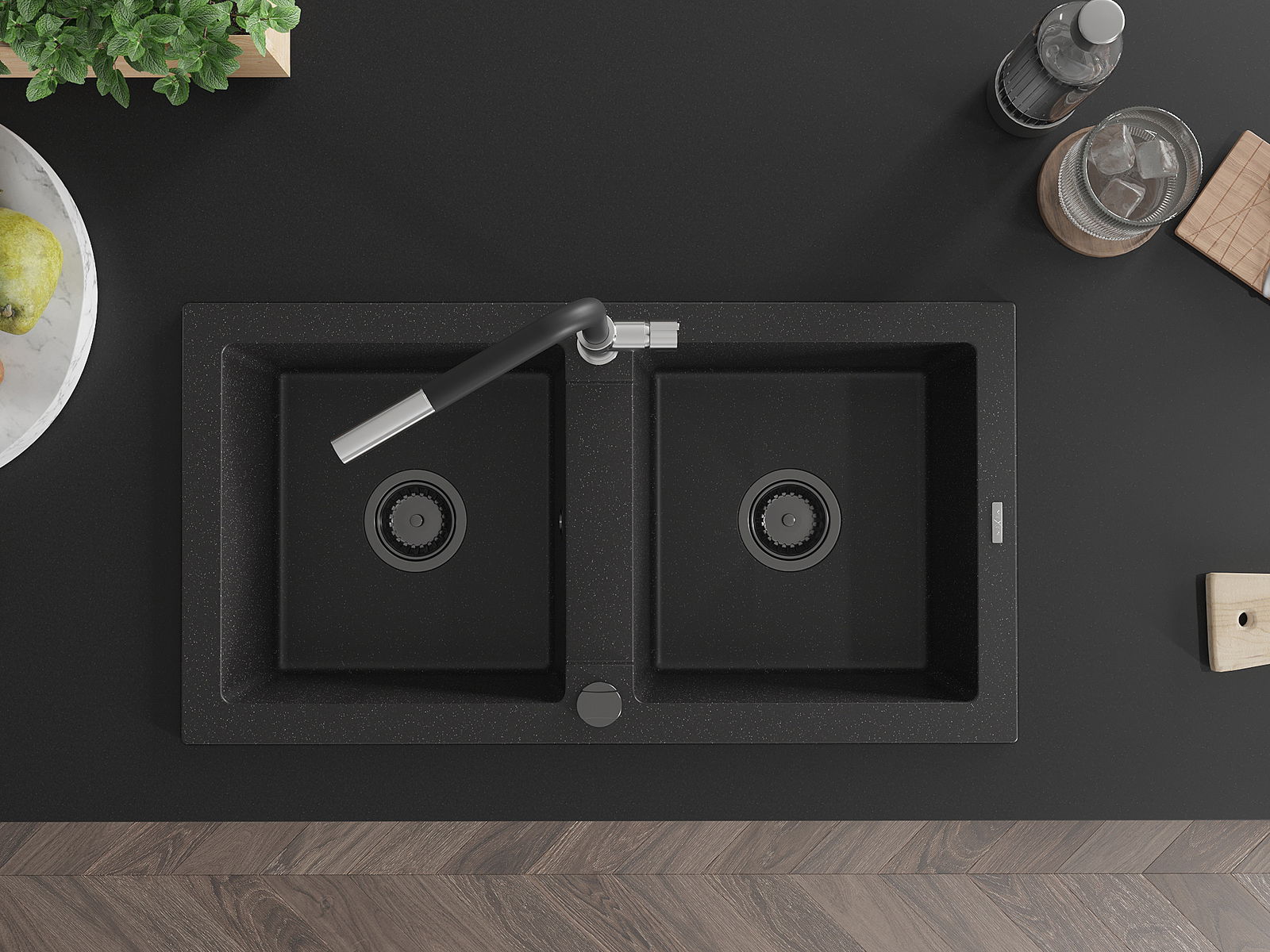 Mexen Mario granite sink 2-bowl with Flora kitchen tap, black/silver metallic - 6504-73-670401-07-B