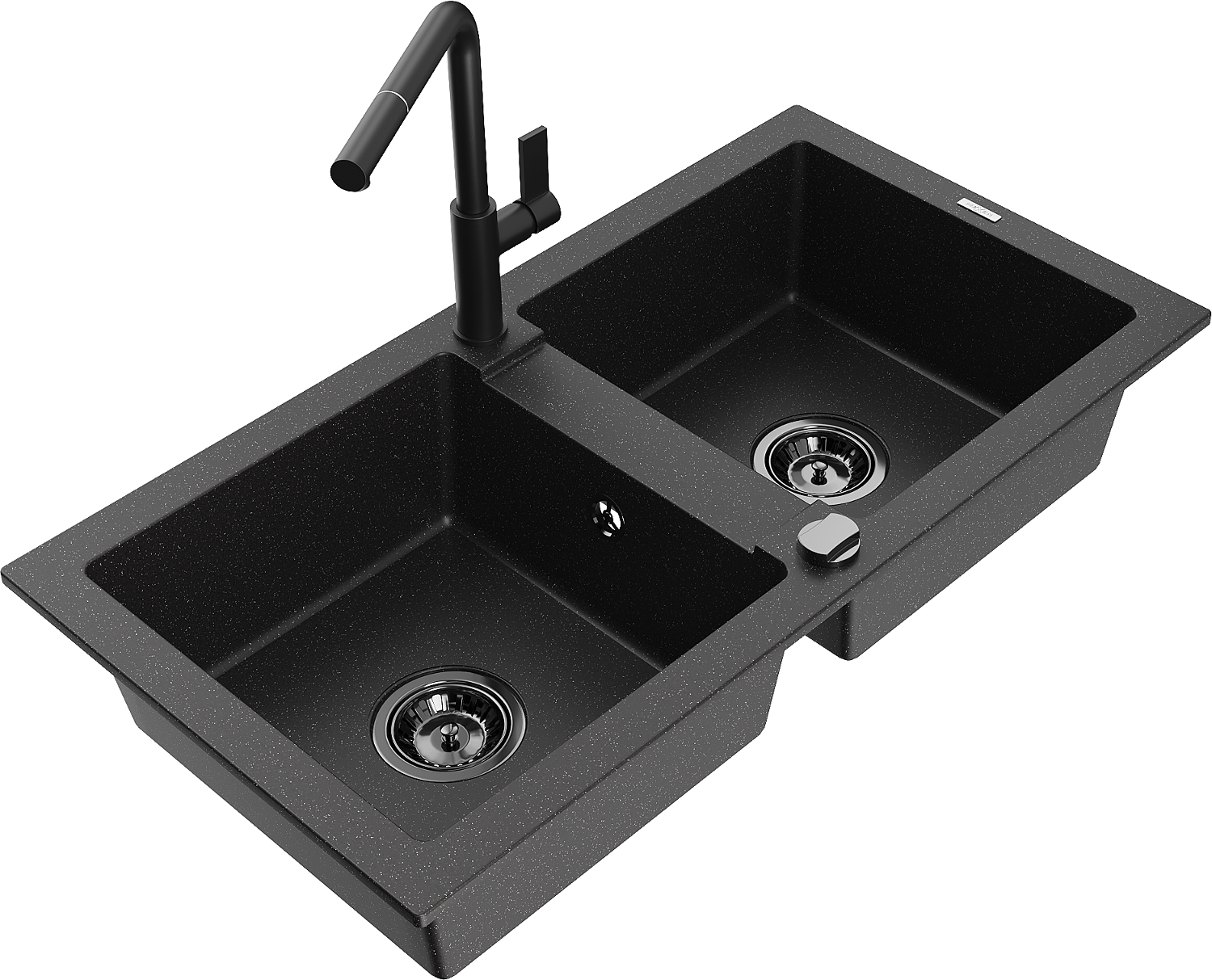 Mexen Mario granite sink 2-chamber with Flora kitchen tap, black/silver metallic - 6504-73-670401-70-B