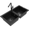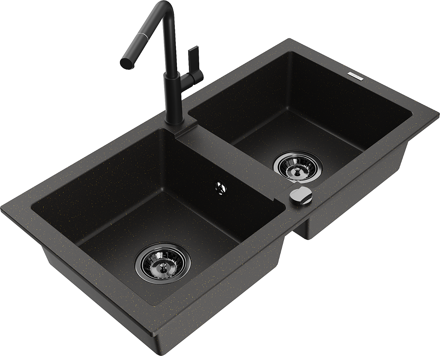 Mexen Mario granite double-bowl sink with Flora kitchen tap, black/gold metallic - 6504-75-670401-70-B