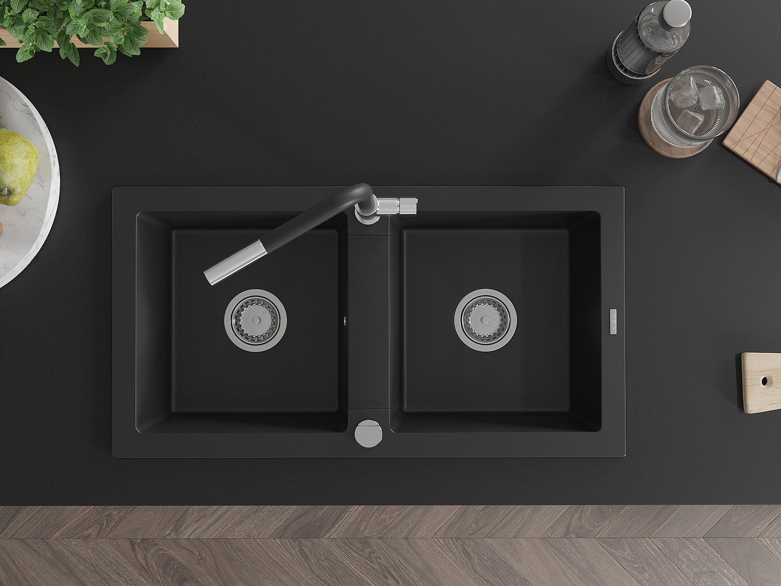 Mexen Mario granite kitchen sink 2-bowl with Flora kitchen tap, black - 6504-77-670401-07
