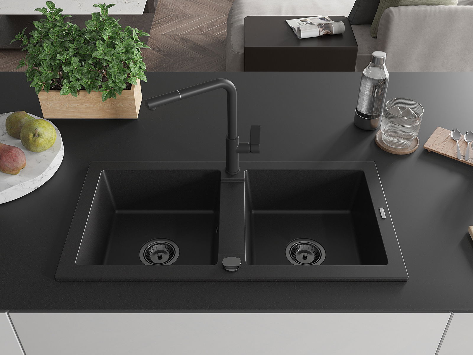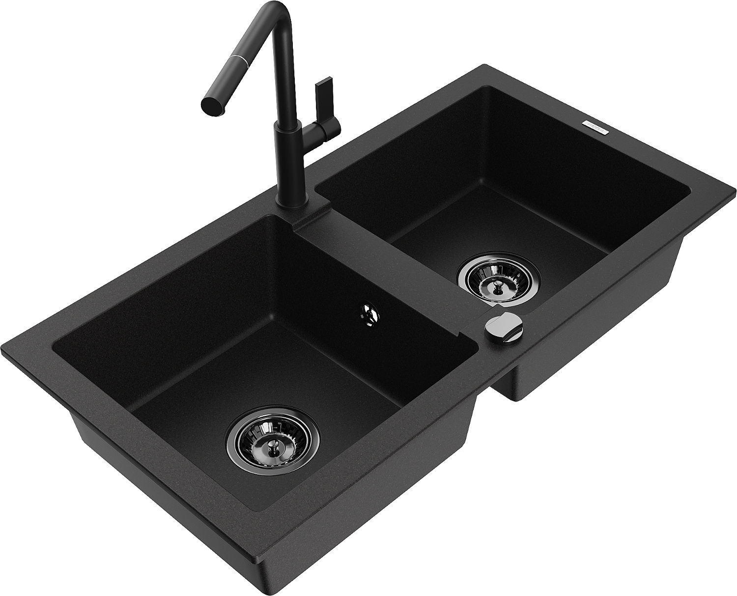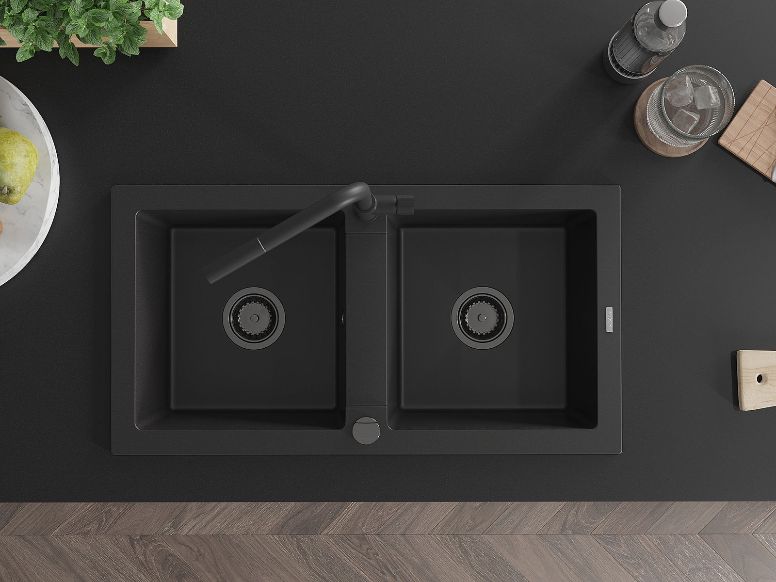 Mexen Mario granite kitchen sink 2-bowl with Flora kitchen tap, black - 6504-77-670401-70-B