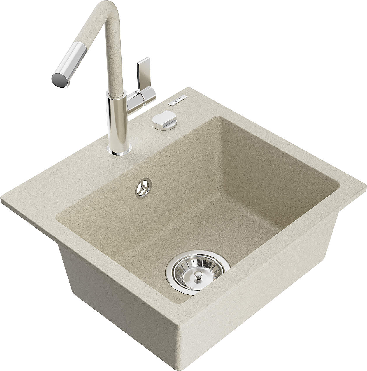 Mexen Milo one-bowl granite sink with Flora kitchen tap, beige - 6505-69-670401-09