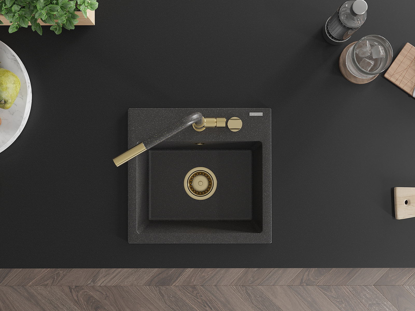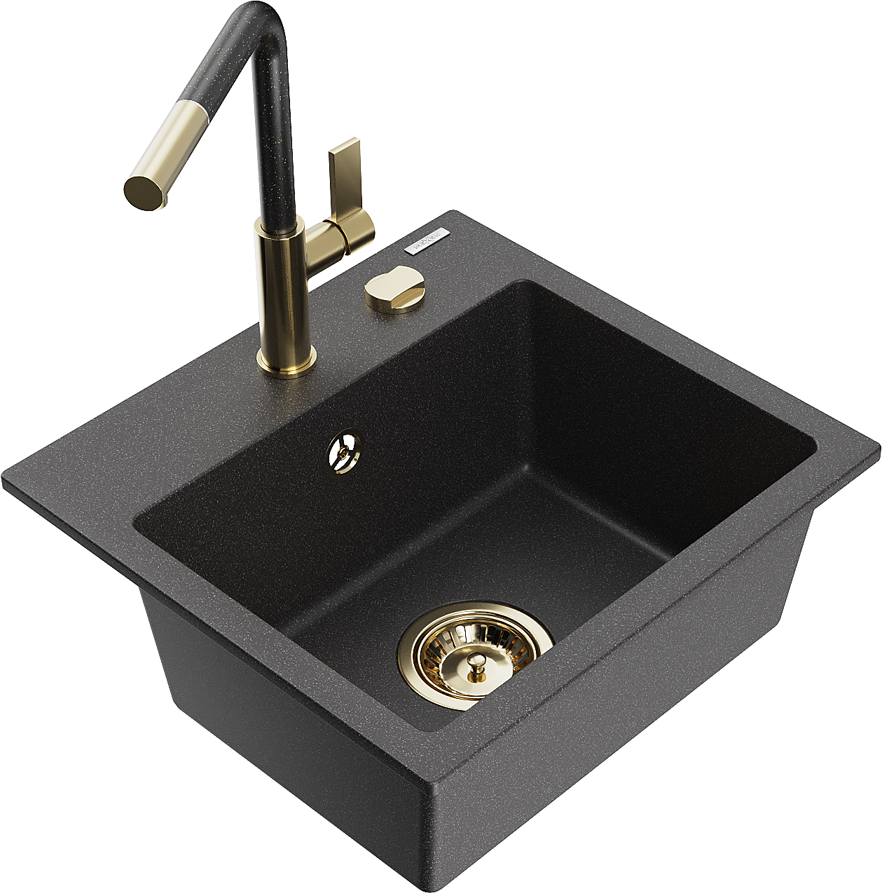 Mexen Milo one-bowl granite sink with Flora kitchen tap, black speckled - 6505-76-670401-75-G