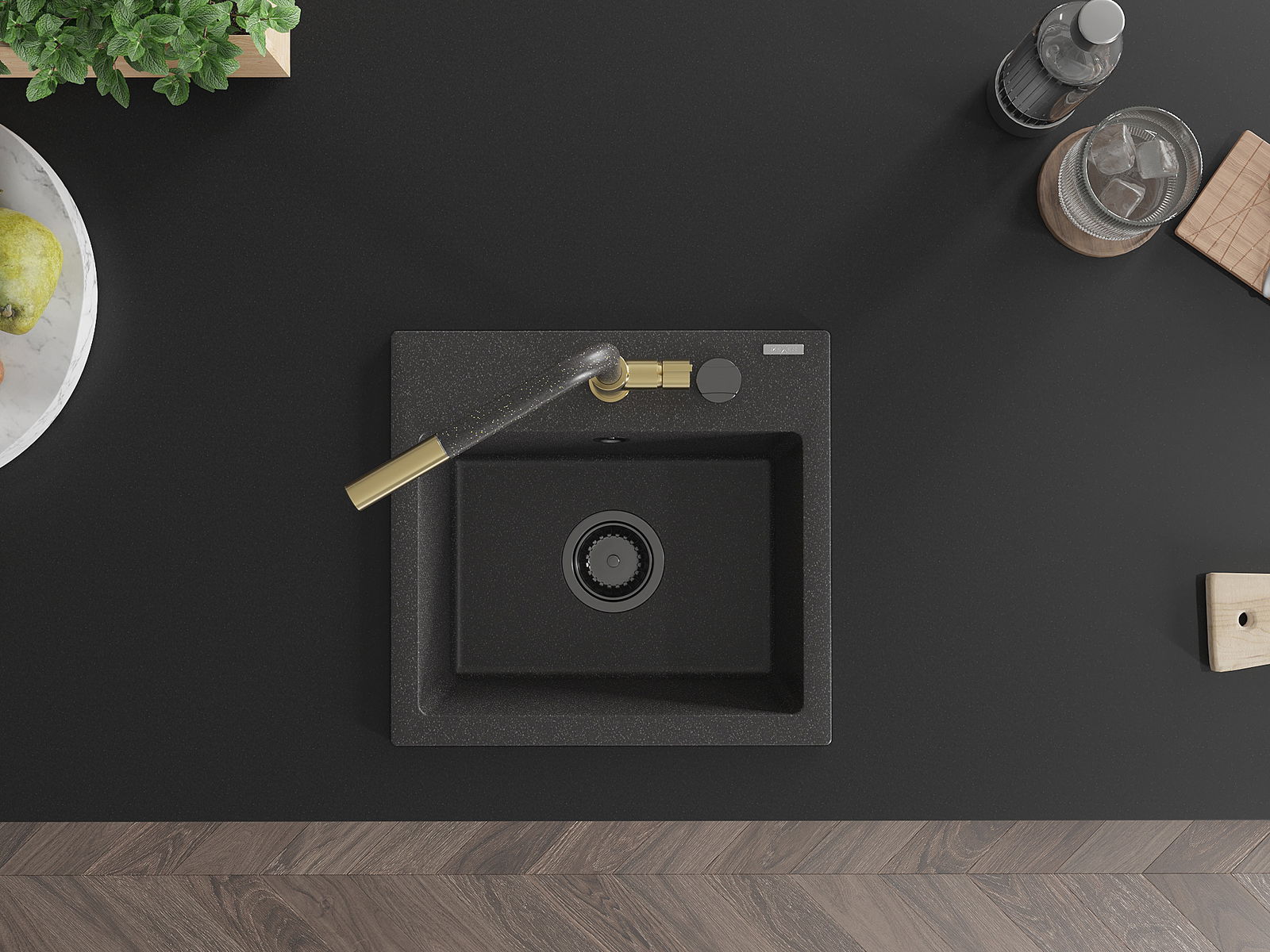 Mexen Milo granite sink single-bowl with Flora kitchen tap, black speckled - 6505-76-670401-75-B