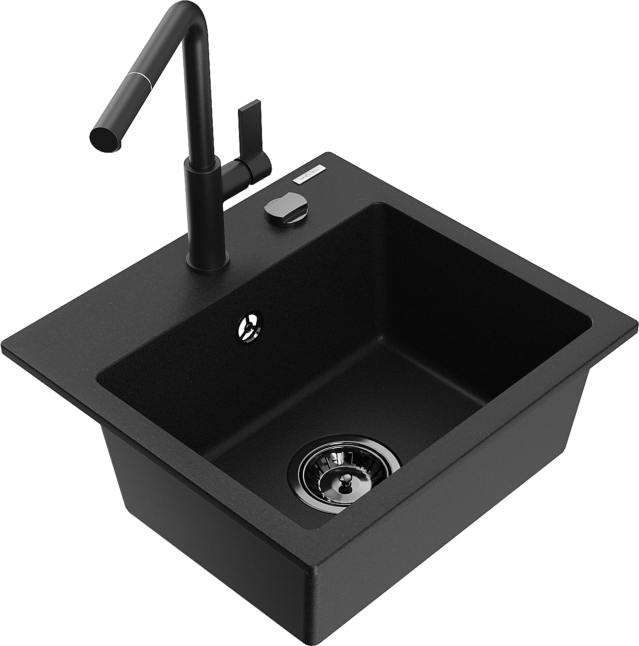 Mexen Milo granite kitchen sink 1-bowl with Flora kitchen tap, black - 6505-77-670401-70-B