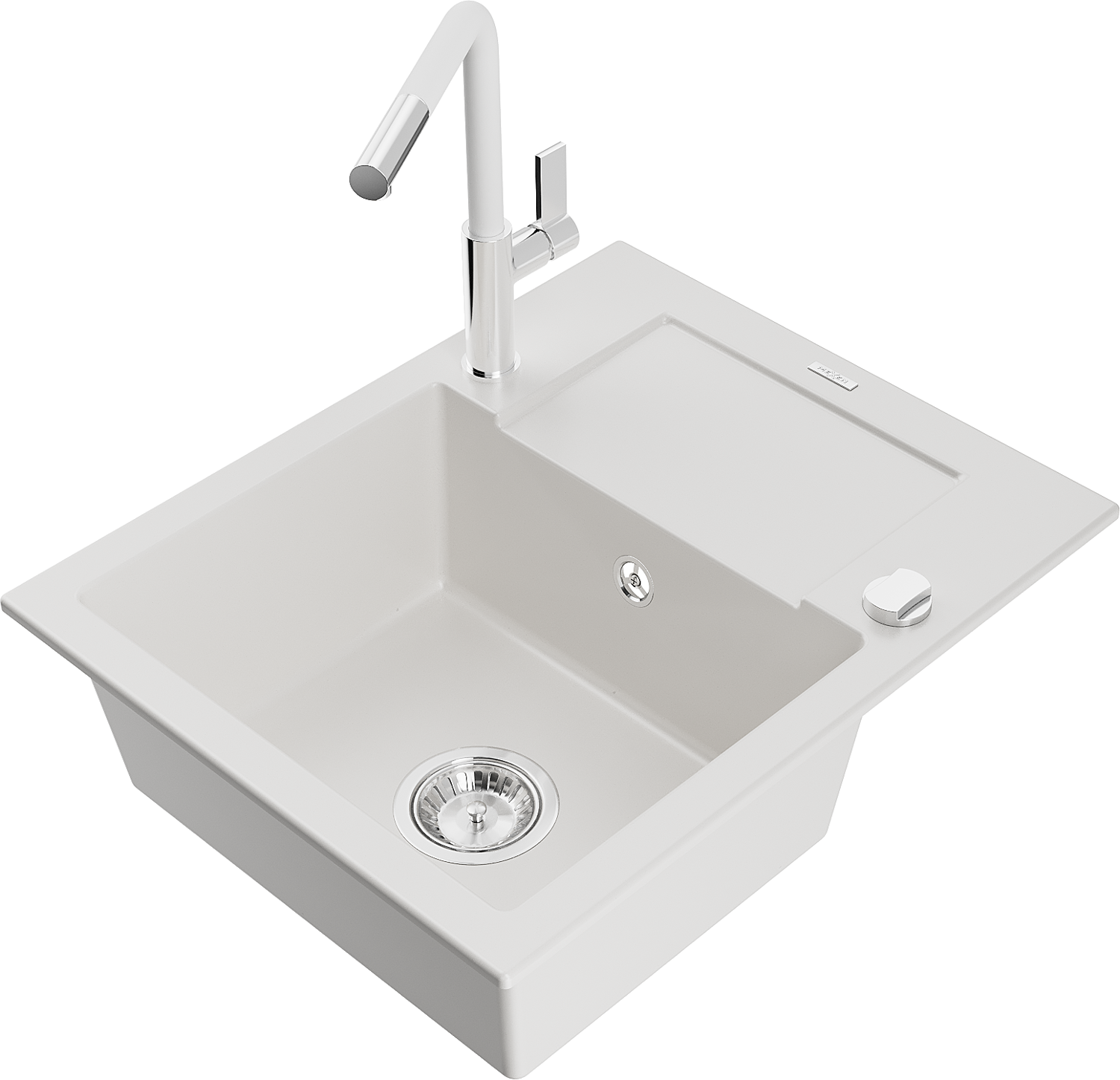 Mexen Enzo granite kitchen sink 1-bowl with drainer and Flora kitchen tap, white - 6506-20-670401-02