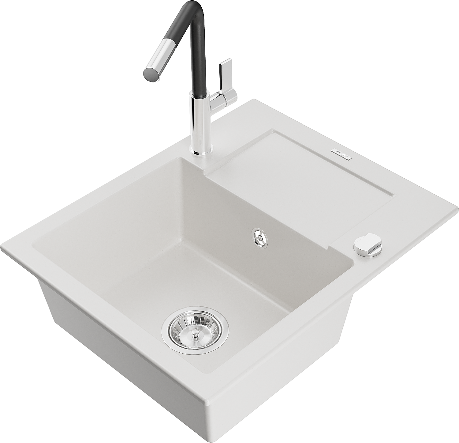 Mexen Enzo granite kitchen sink 1-bowl with drainer and Flora kitchen tap, white - 6506-20-670401-07
