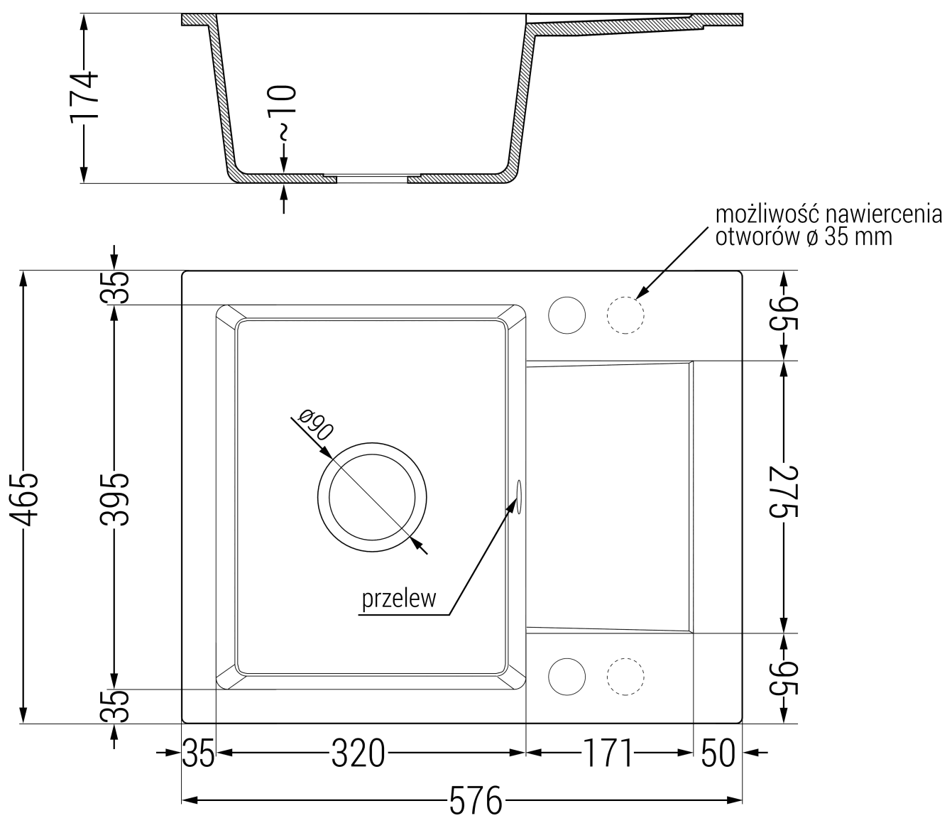The sink has 2 linked holes with a diameter of 35 mm, for self -burst. They can be used, among others For mounting a liquid dispenser that will eliminate the presence of plastic bottles in the kitchen and give it an elegant finish.