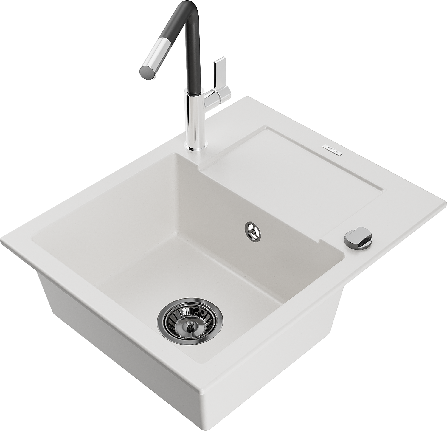 Mexen Enzo 1-bowl granite sink with drainer and Flora kitchen tap, white - 6506-20-670401-07-B