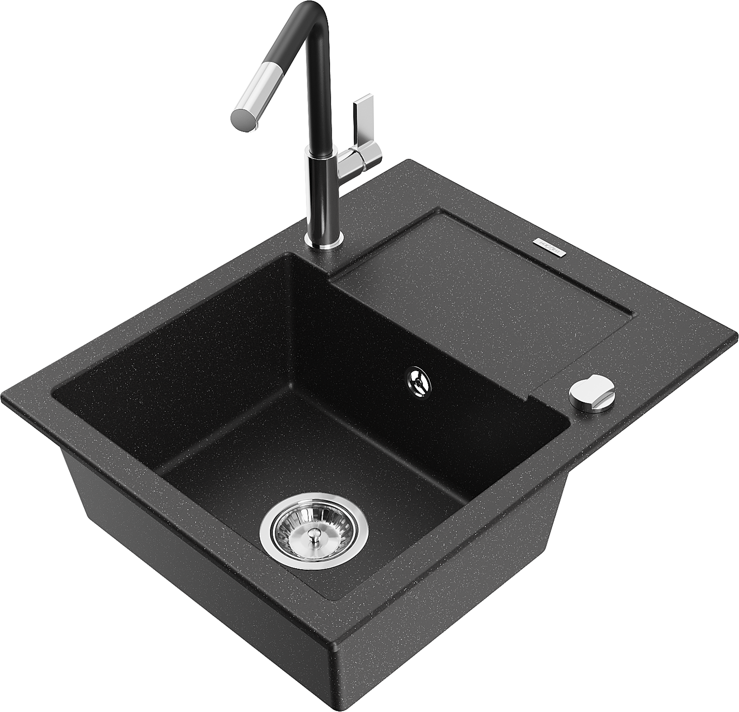 Mexen Enzo granite sink single-bowl with drainer and Flora kitchen tap, black/silver metallic - 6506-73-670401-07