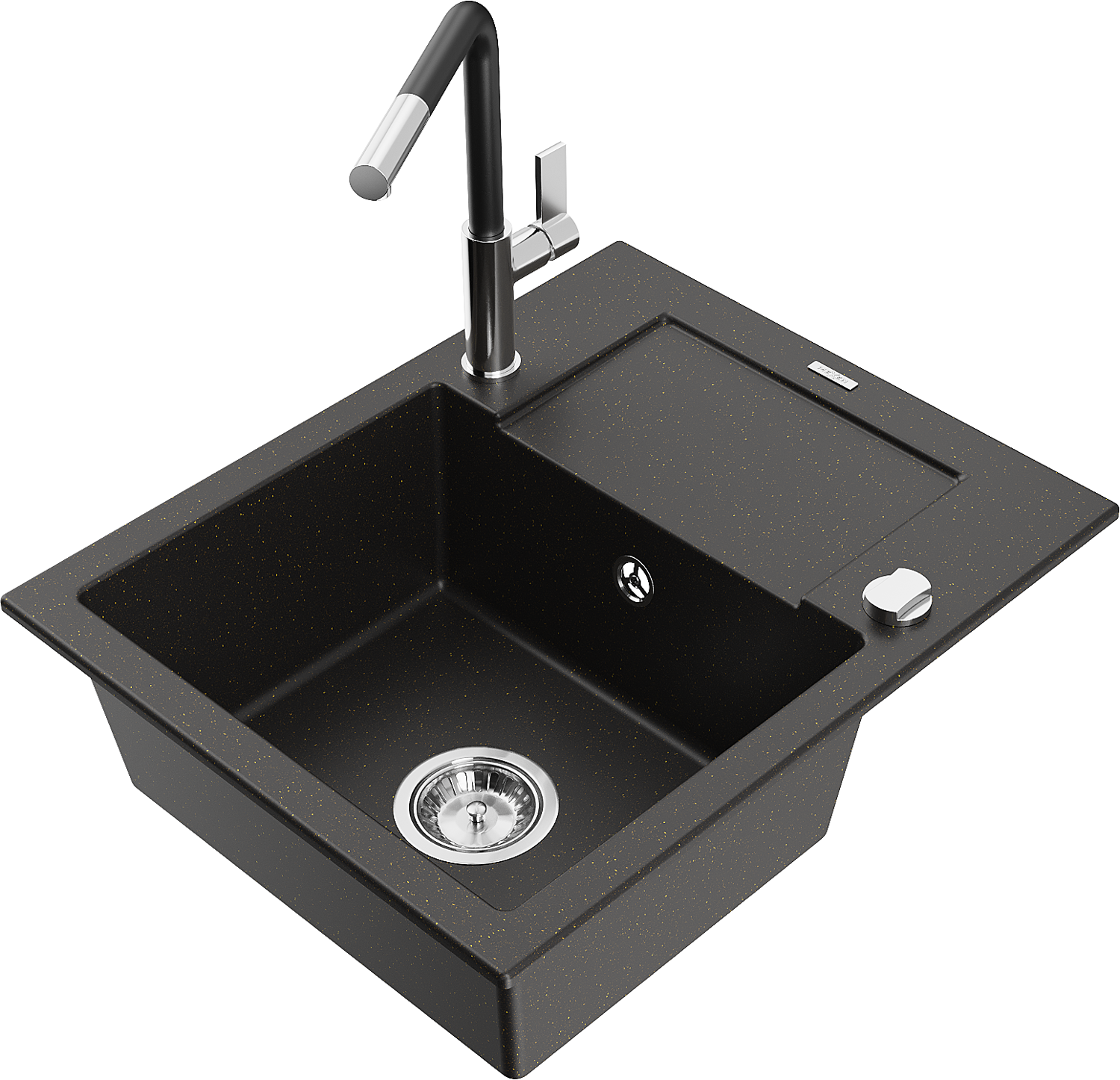 Mexen Enzo granite kitchen sink 1-bowl with drainer and Flora kitchen tap, black/gold metallic - 6506-75-670401-07
