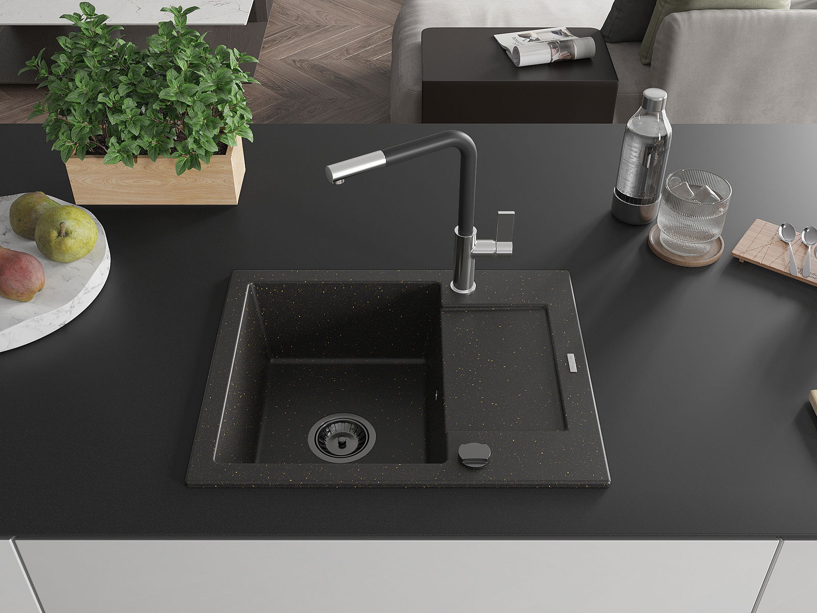 The sink is made of high quality granite. It is an elegant and, above all, practical complement to every kitchen, regardless of its style. High quality and granite durability ensure many years of use.