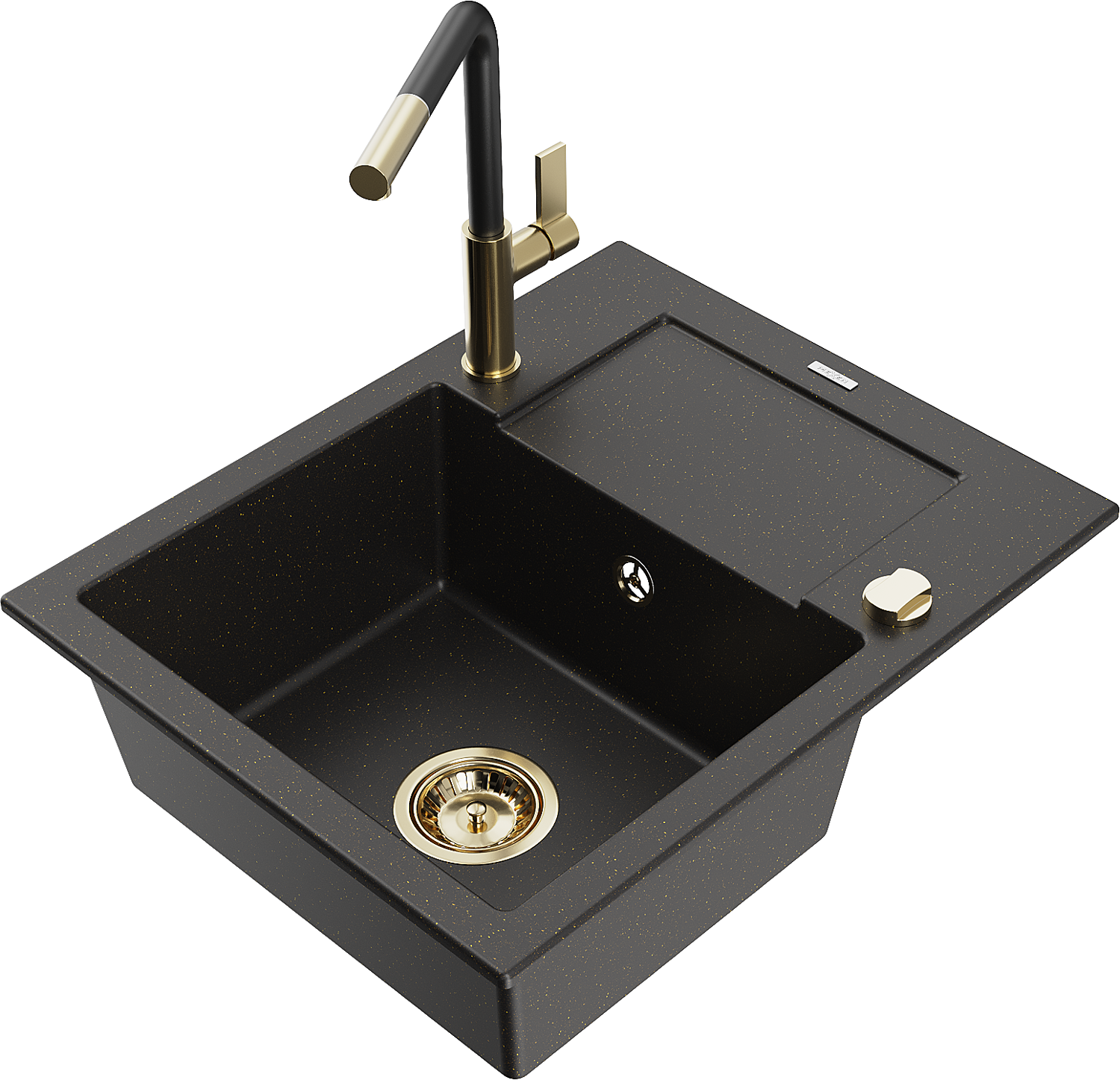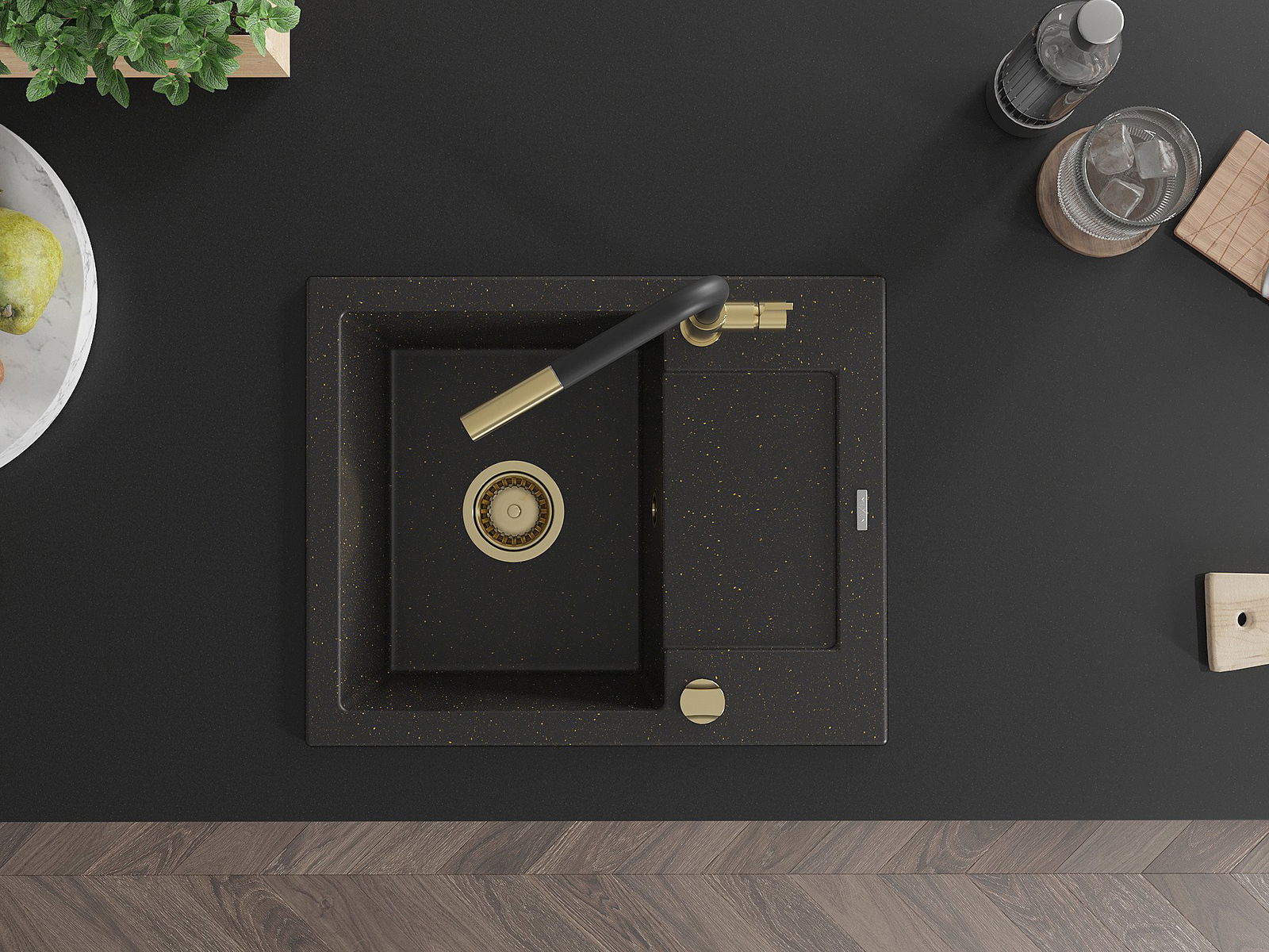 Mexen Enzo granite kitchen sink 1-bowl with drainer and Flora kitchen tap, black/gold metallic - 6506-75-670401-57-G