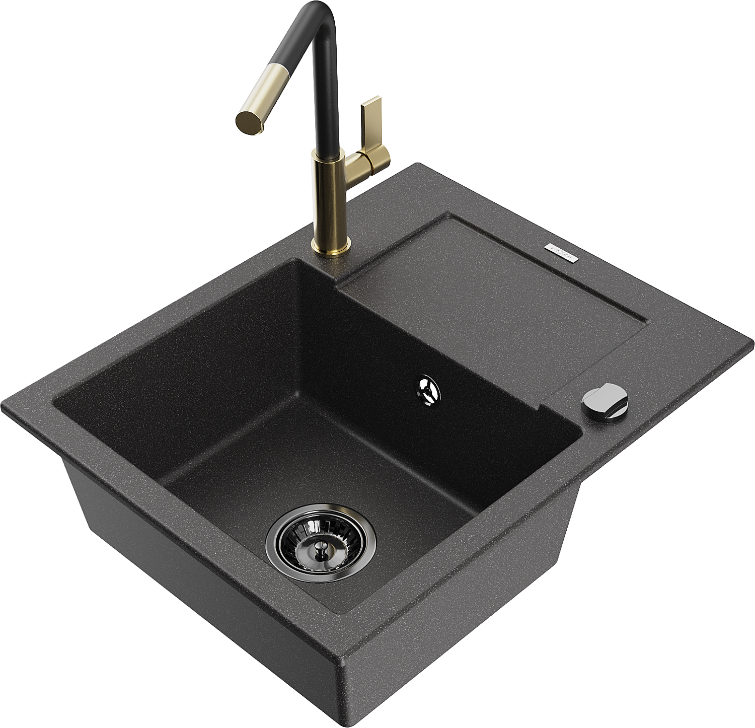 Mexen Enzo granite sink 1-bowl with drainer and Flora kitchen tap, black speckled - 6506-76-670401-57-B