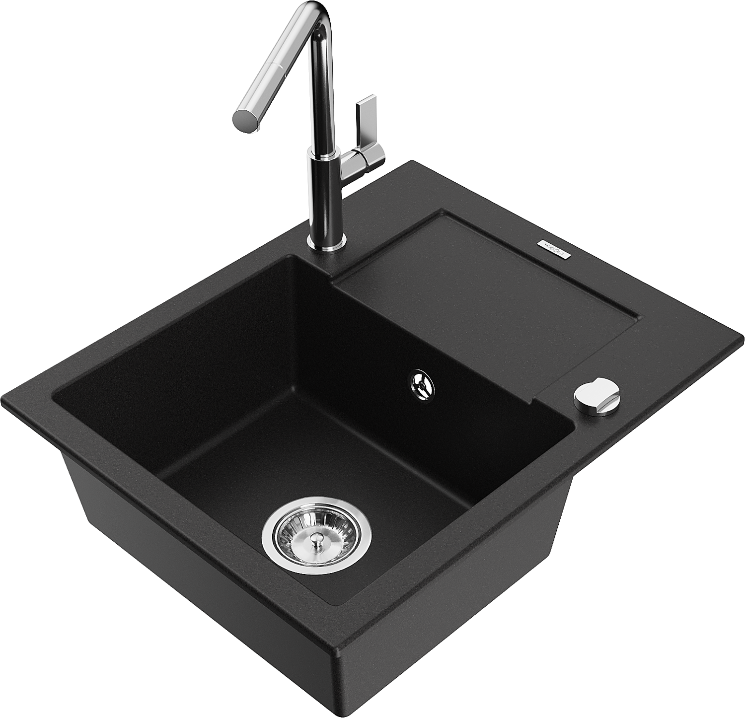 Mexen Enzo granite sink 1-bowl with drainer and Flora kitchen tap, black - 6506-77-670401-00