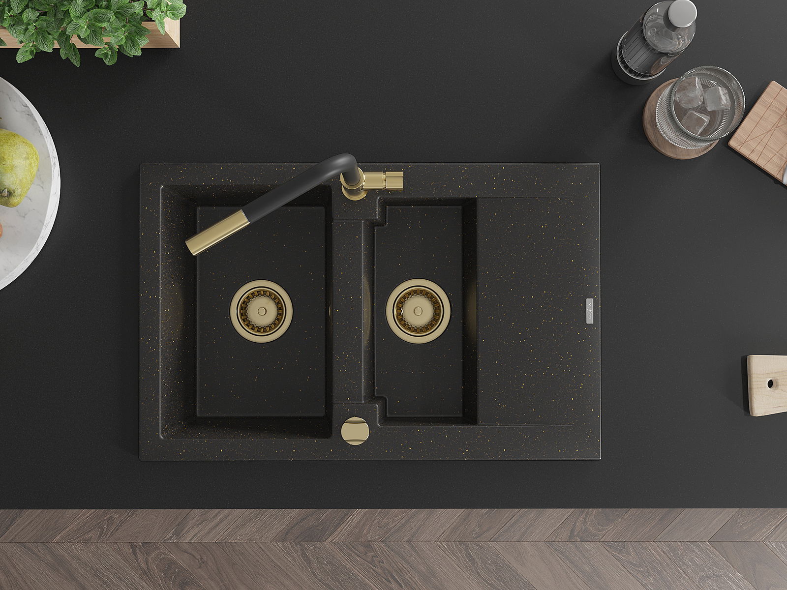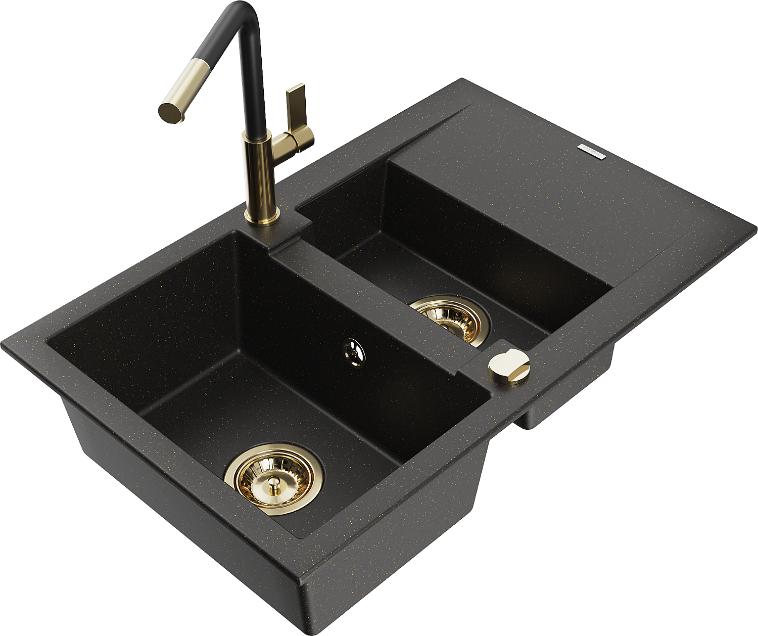 Mexen Gaspar granite sink 1.5-bowl with drainer and Flora kitchen tap, black/gold - 6507-75-670401-57-G