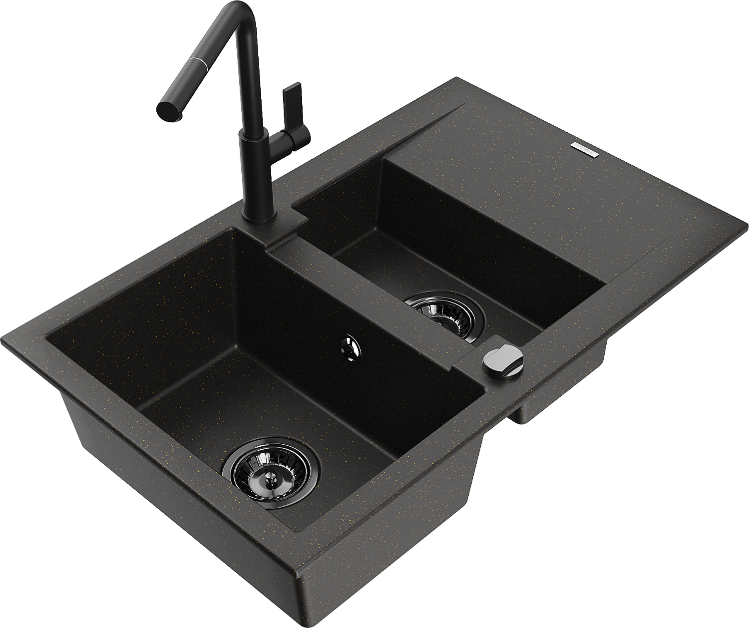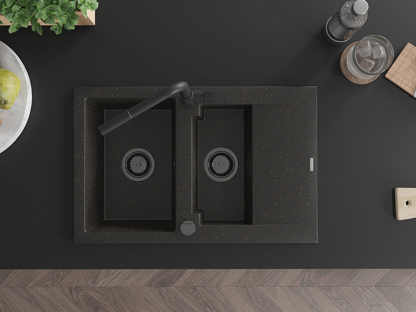 Mexen Gaspar granite sink 1.5-bowl with drainer and kitchen tap Flora, black/gold - 6507-75-670401-70-B