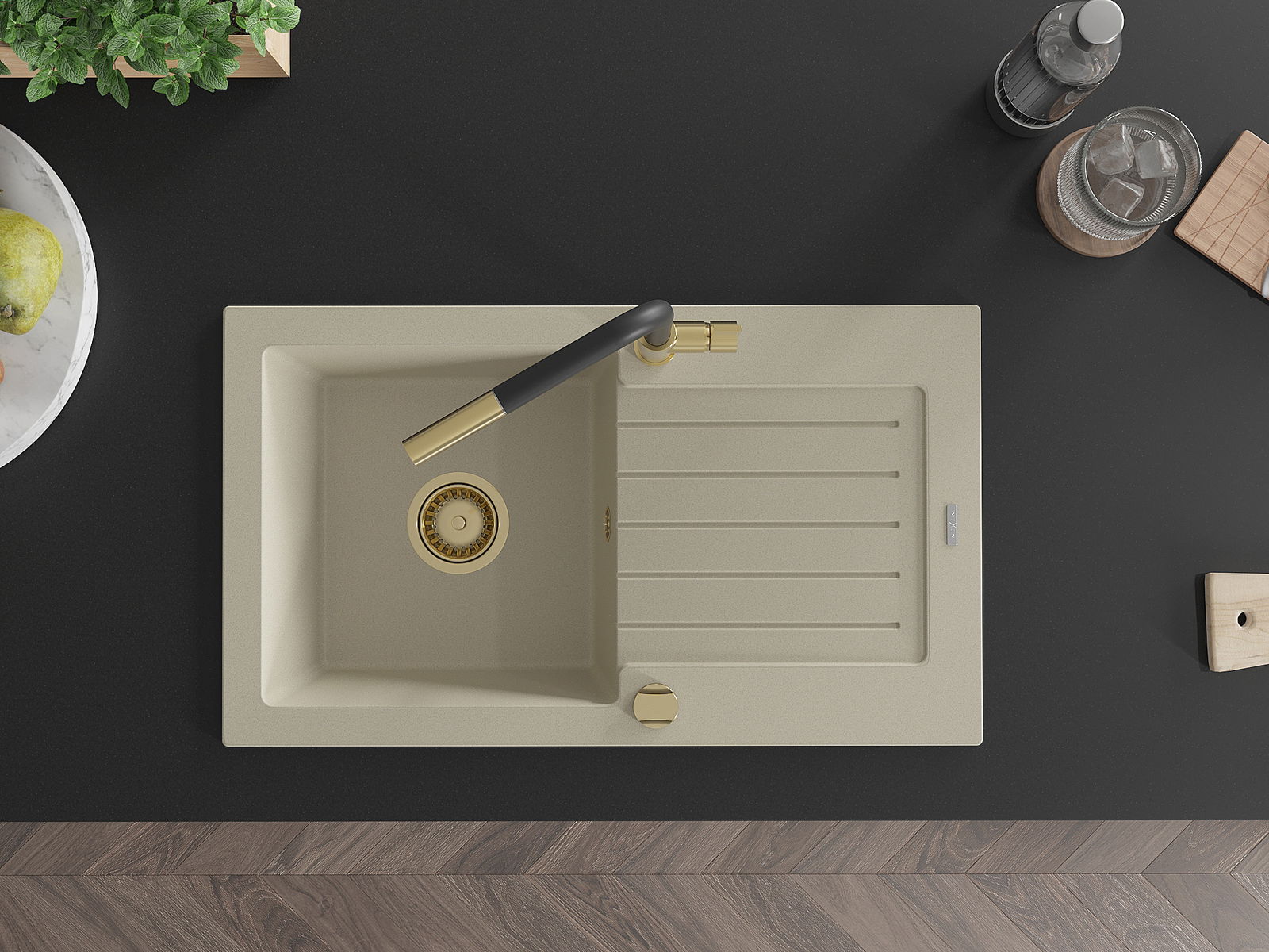 Mexen Pablo 1-bowl granite sink with drainer and Flora kitchen tap, beige - 6510-69-670401-57-G