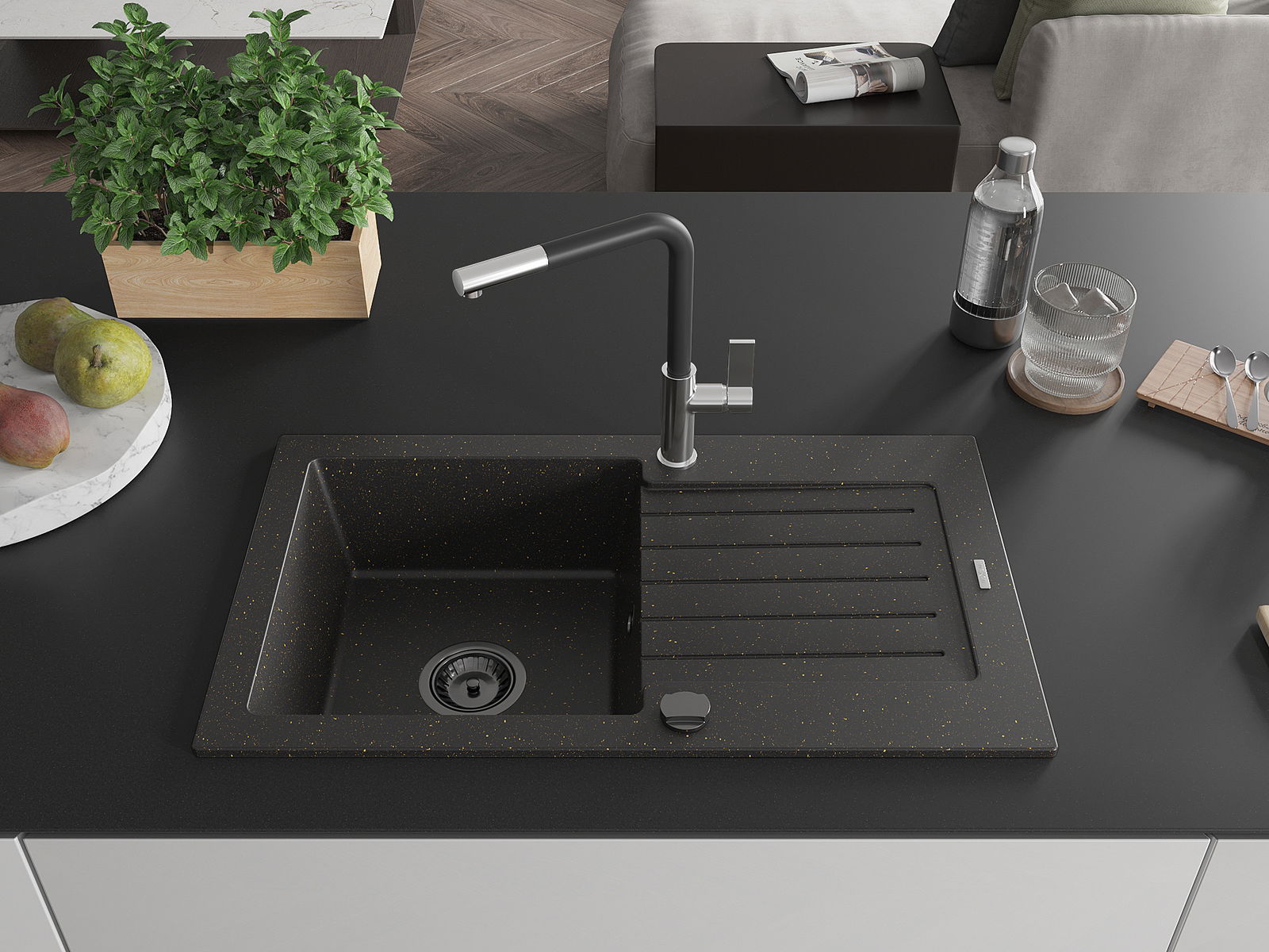 Mexen Pablo Granite Kitchen Sink 1-Bowl with Drainer and Kitchen Tap Flora, Black/Gold Metallic - 6510-75-670401-07-B