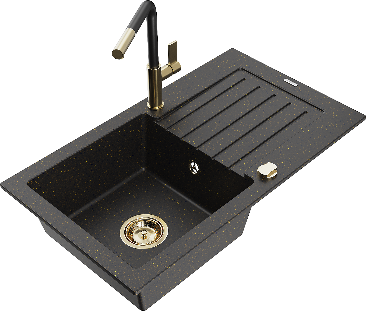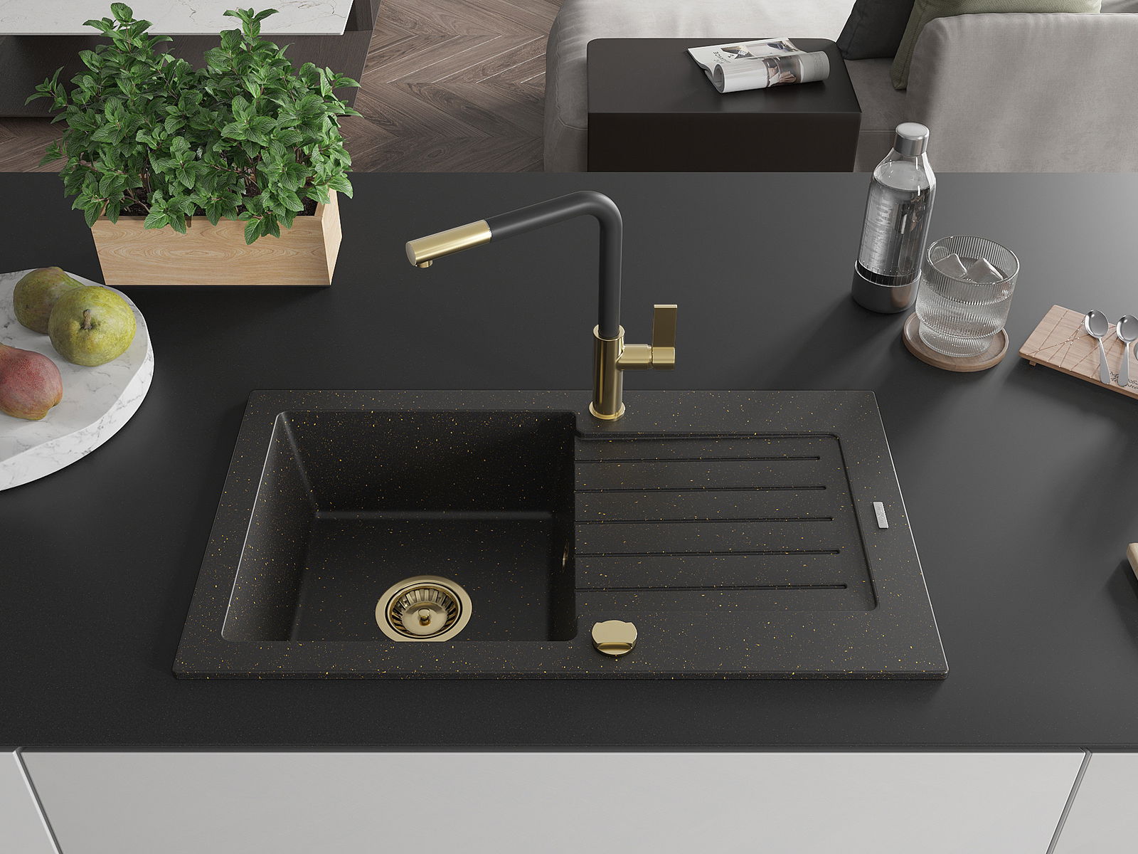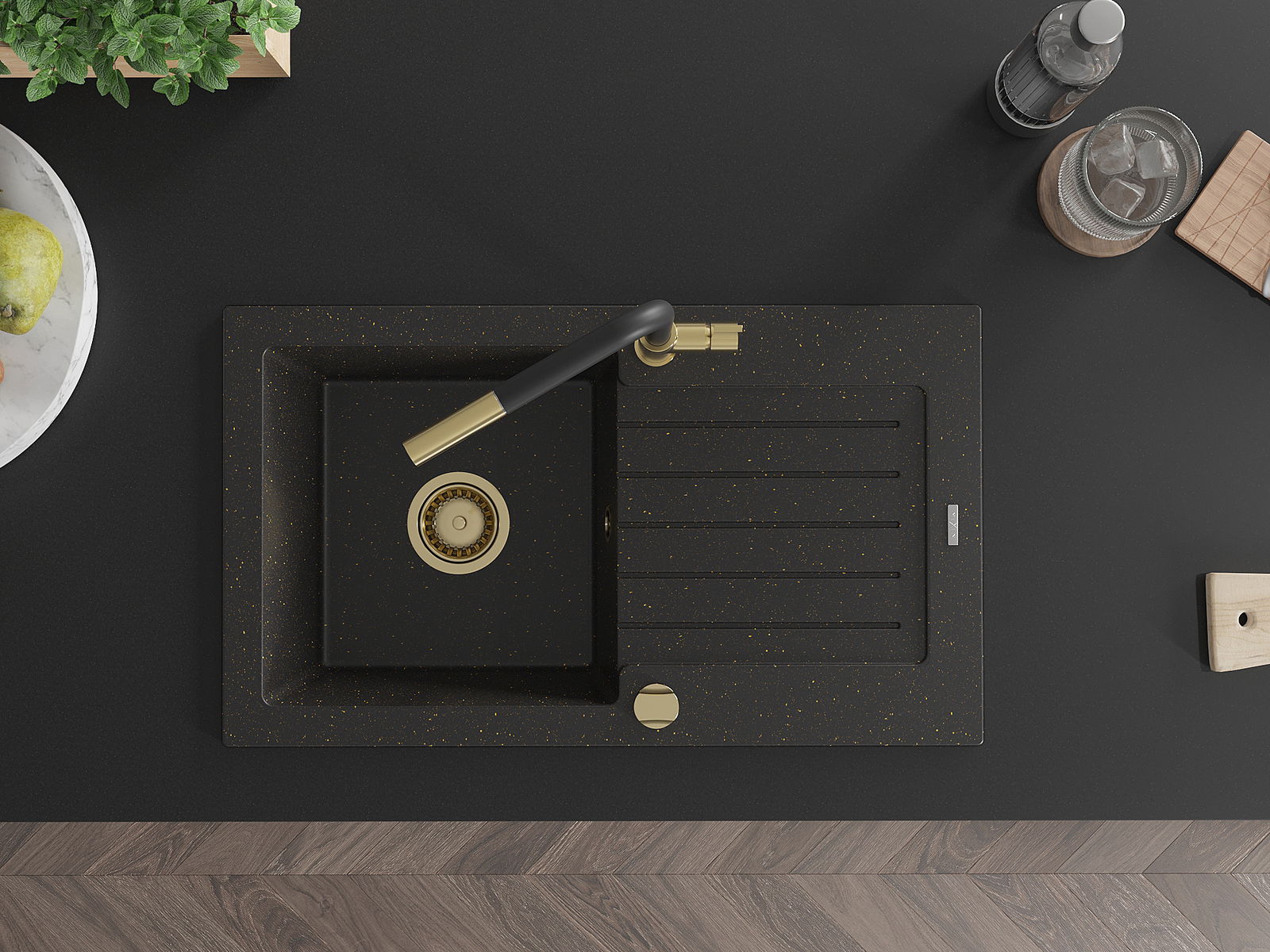 Mexen Pablo granite kitchen sink 1-bowl with drainer and Flora kitchen tap, black/gold metallic - 6510-75-670401-57-G