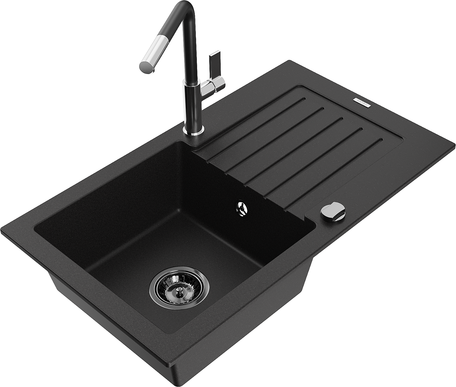 Mexen Pablo 1-bowl Granite Sink with Drainer and Flora Kitchen Tap, Black - 6510-77-670401-07-B