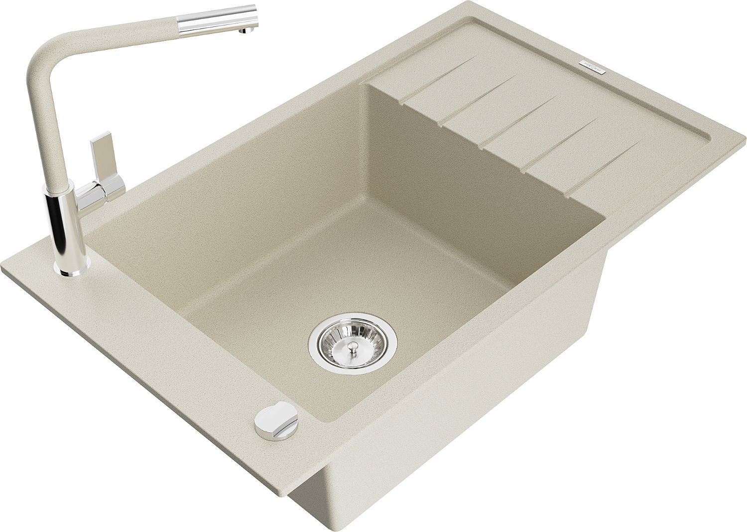 Mexen Elias 1-bowl granite kitchen sink with drainer and Flora kitchen mixer, beige - 6511-69-670401-09