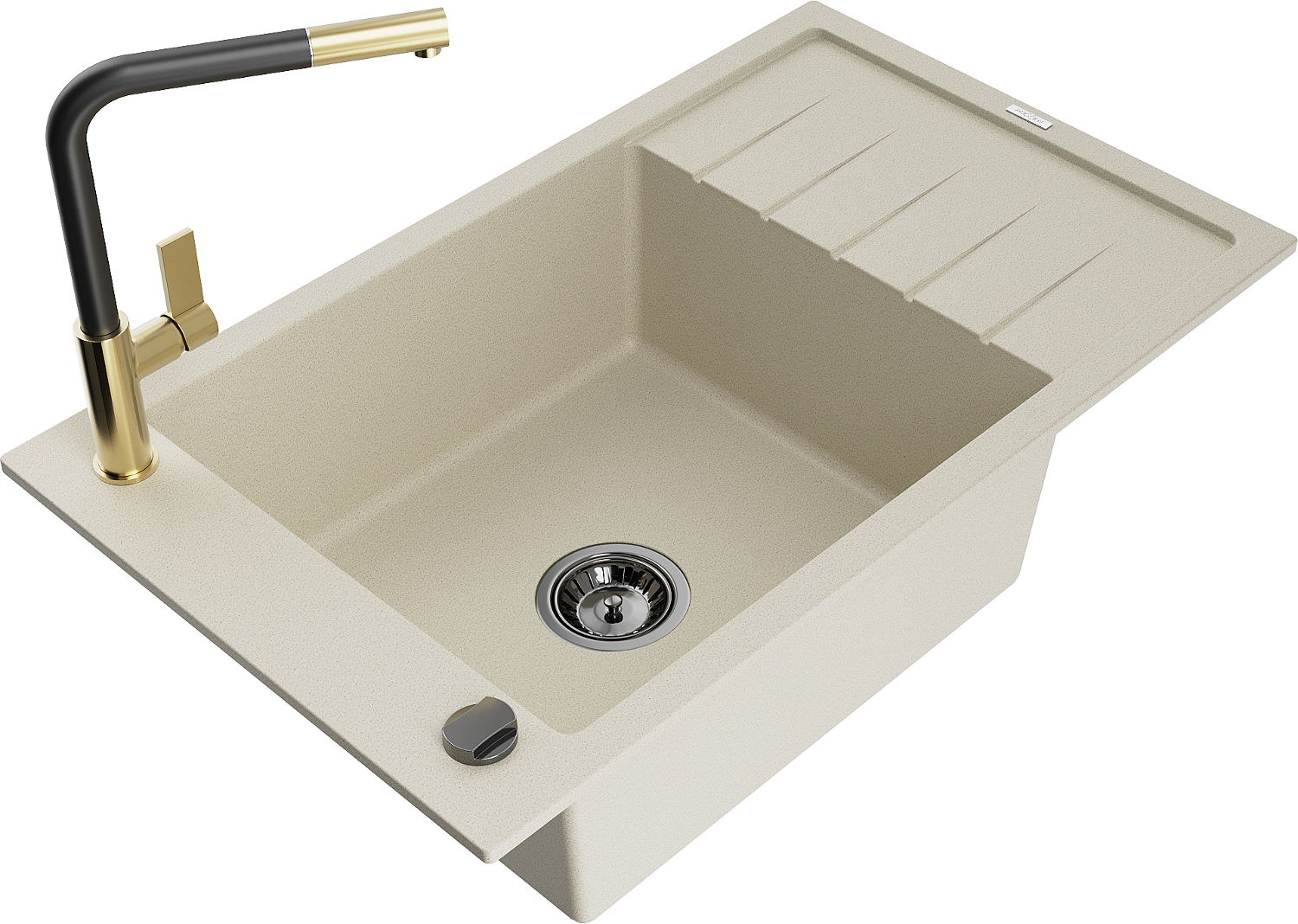 Mexen Elias granite sink 1-bowl with drainer and Flora kitchen faucet, beige - 6511-69-670401-57-B