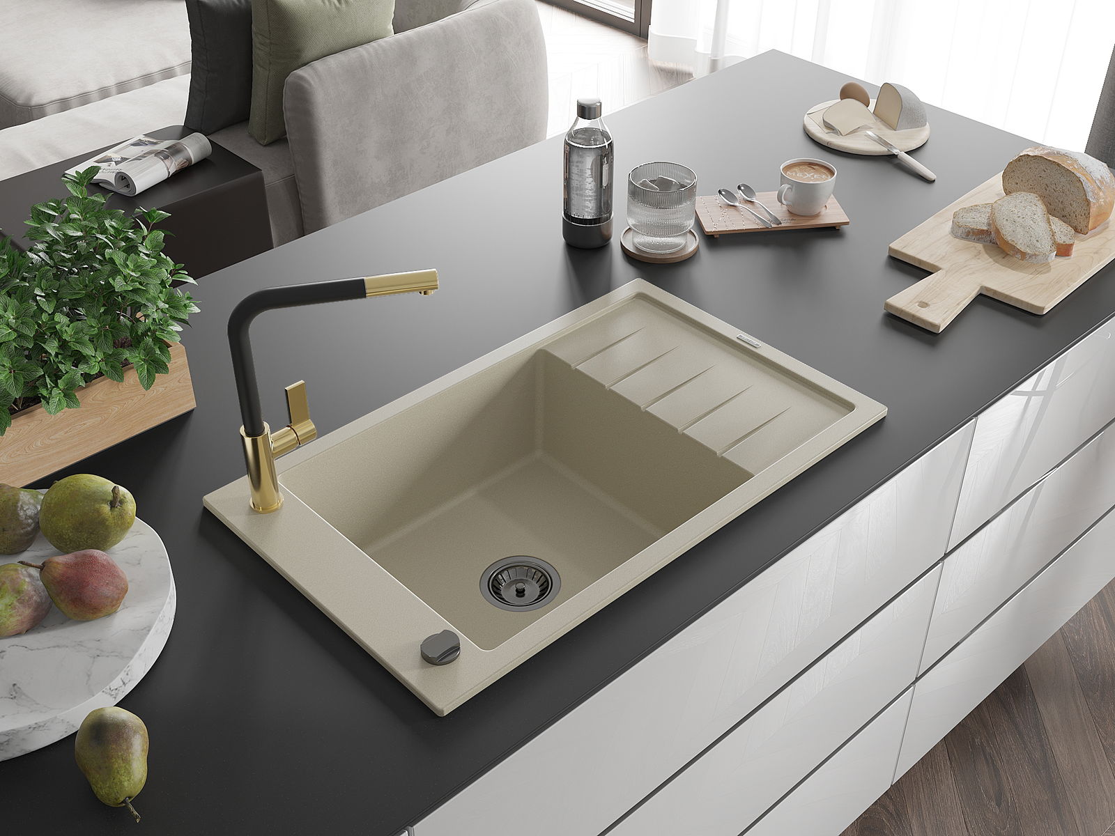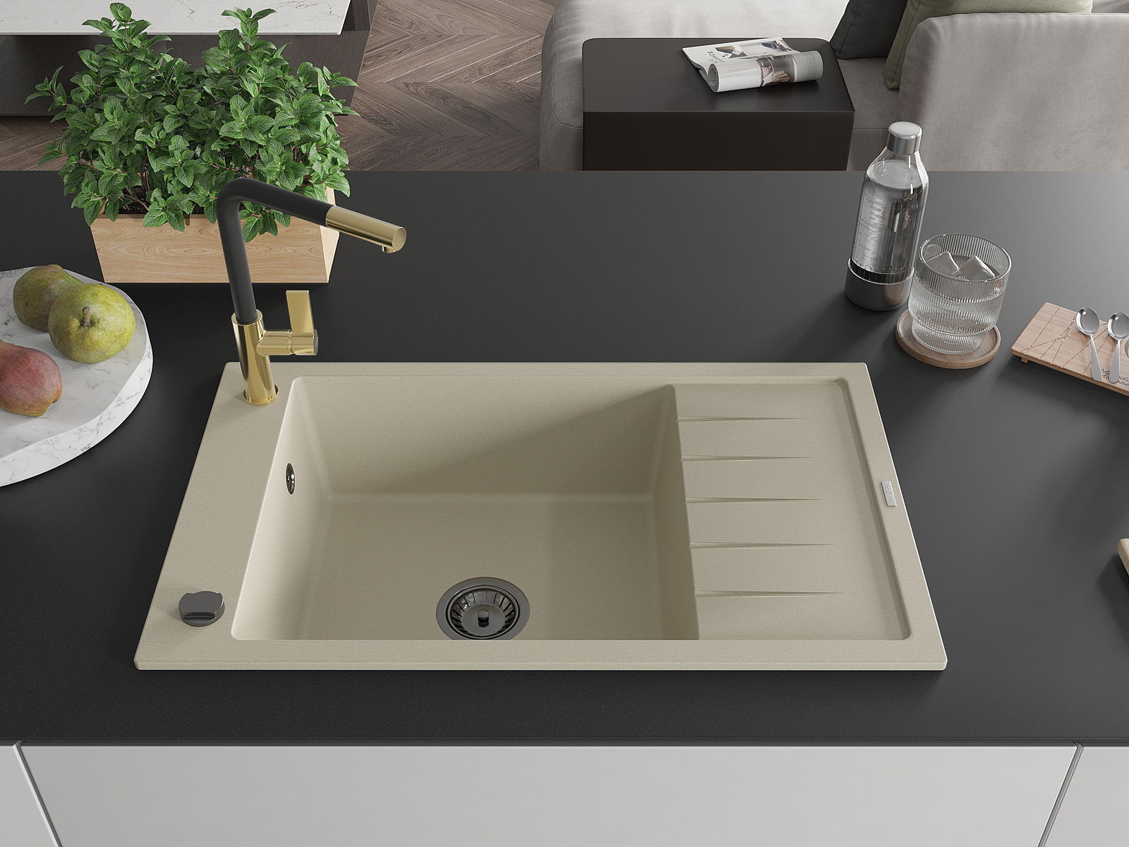 The sink is made of high quality granite. It is an elegant and, above all, practical complement to every kitchen, regardless of its style. High quality and granite durability ensure many years of use.
