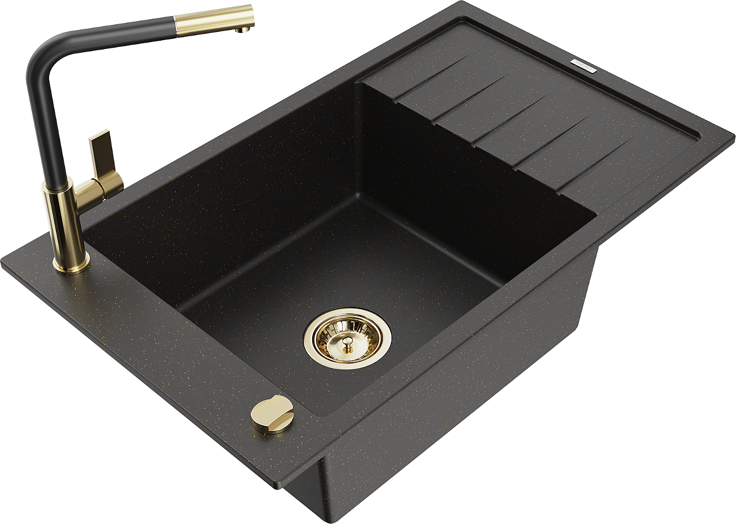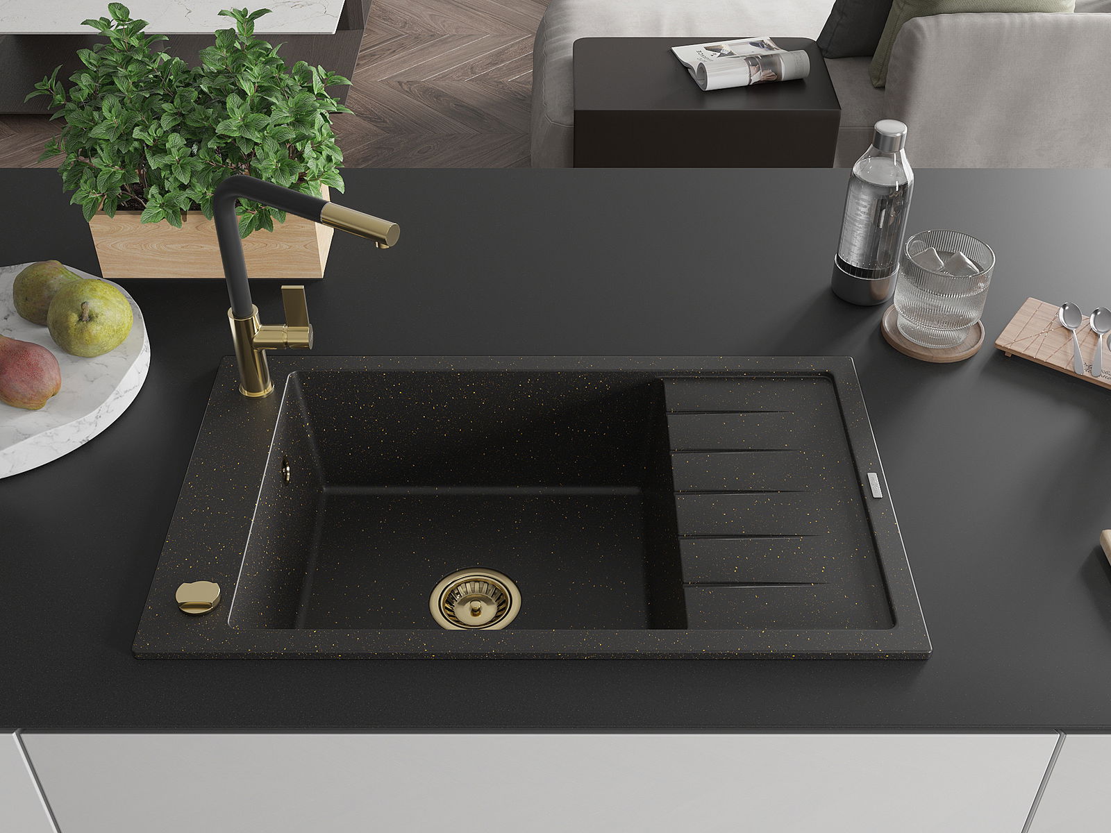 Mexen Elias granite sink single-bowl with drainer and Flora kitchen tap, black/golden metallic - 6511-75-670401-57-G