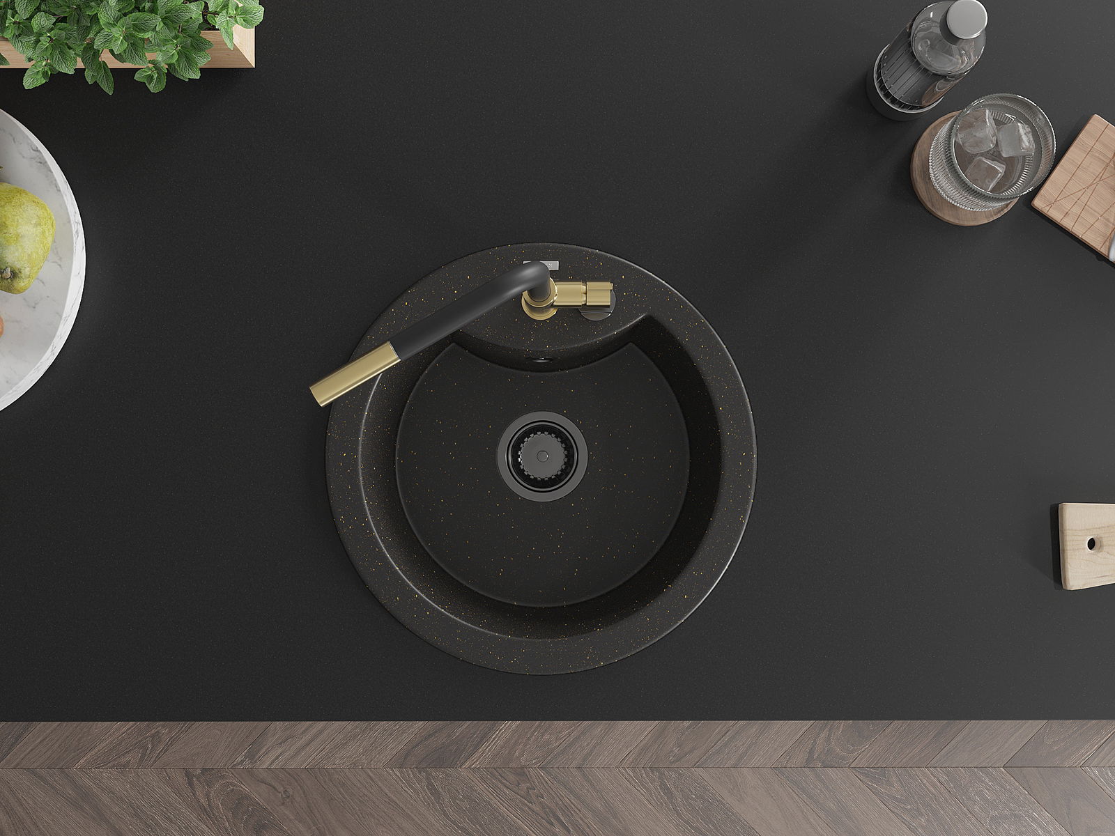 Mexen Diego 1-bowl granite sink with Flora kitchen tap, black/gold metallic - 6512-75-670401-57-B