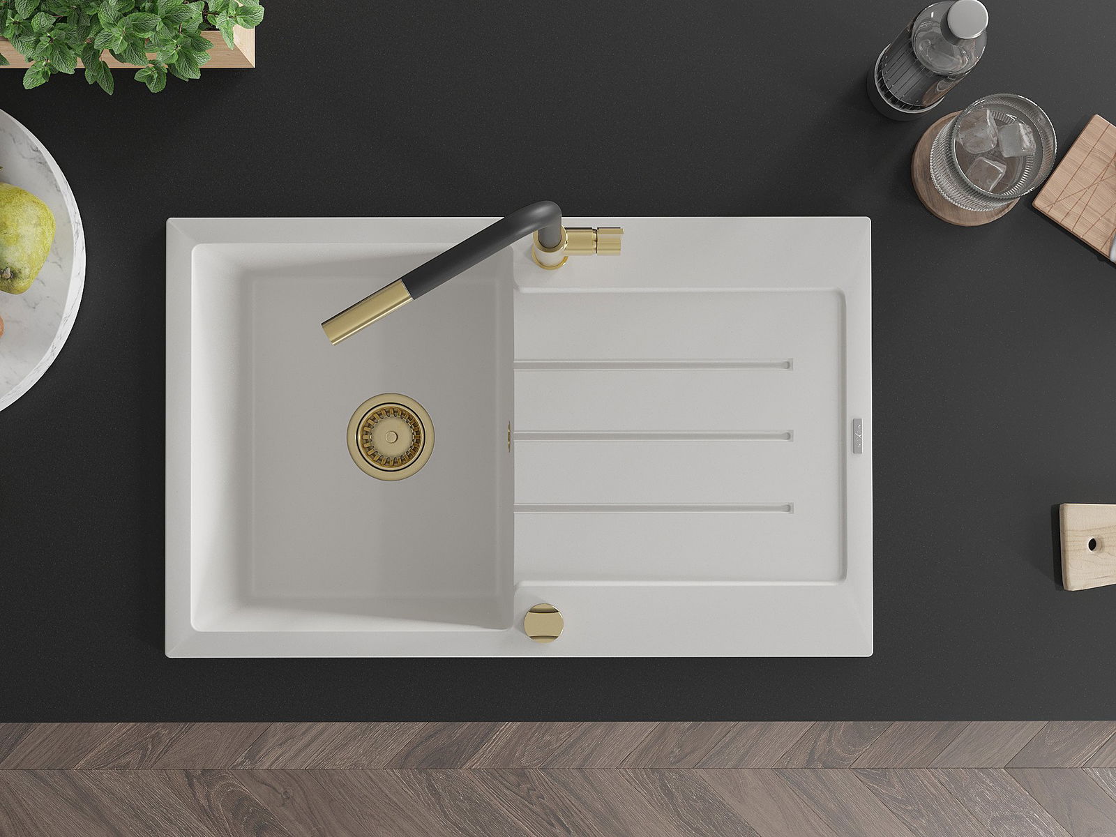 Mexen Bruno granite sink 1-bowl with drainer and Flora kitchen tap, white - 6513-20-670401-57-G