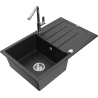 Mexen Bruno granite sink 1-bowl with drainer and Flora kitchen tap, black/golden metallic - 6513-75-670401-00