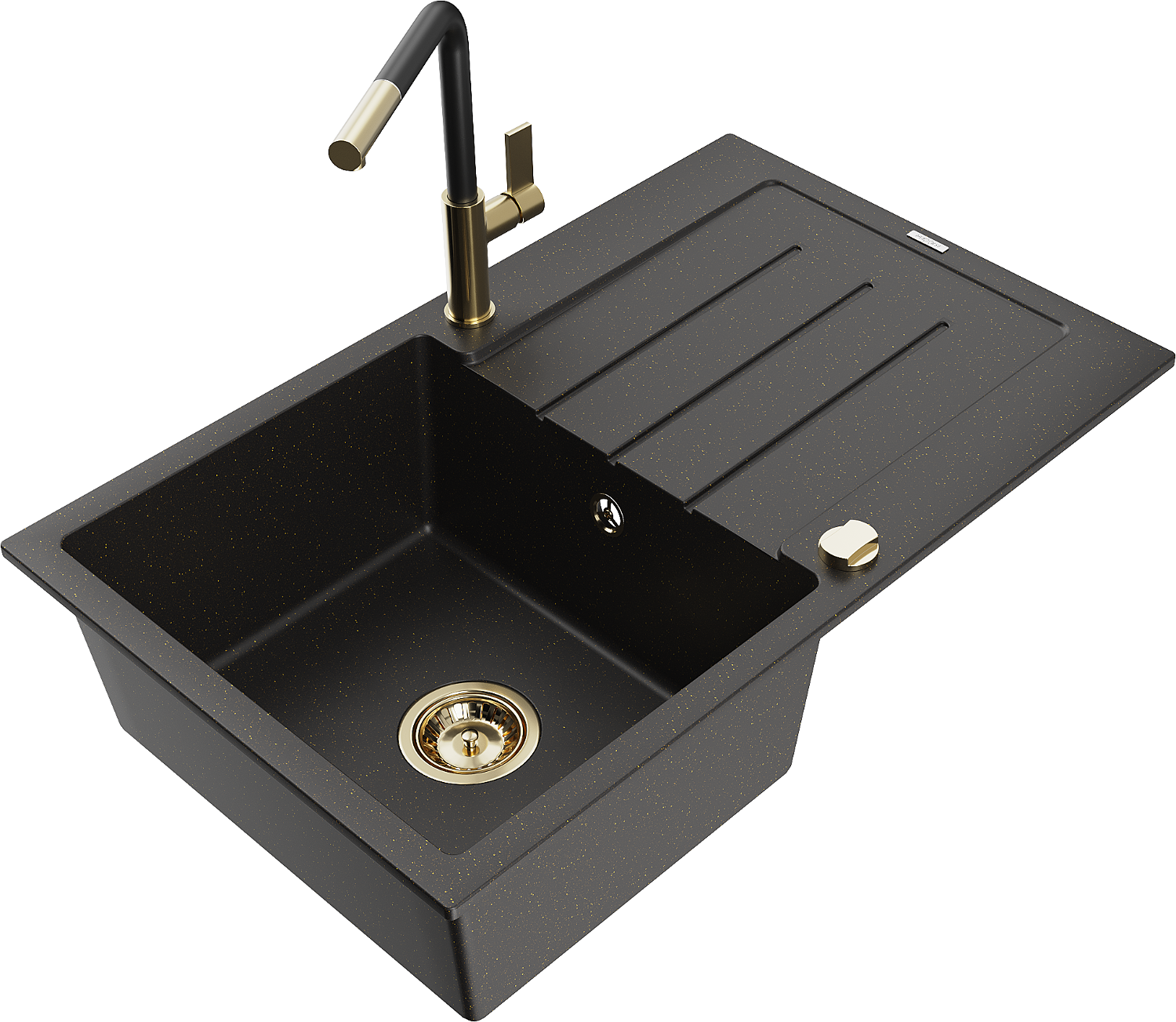 Mexen Bruno granite sink 1-bowl with drainer and Flora kitchen tap, black/gold metallic - 6513-75-670401-57-G