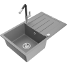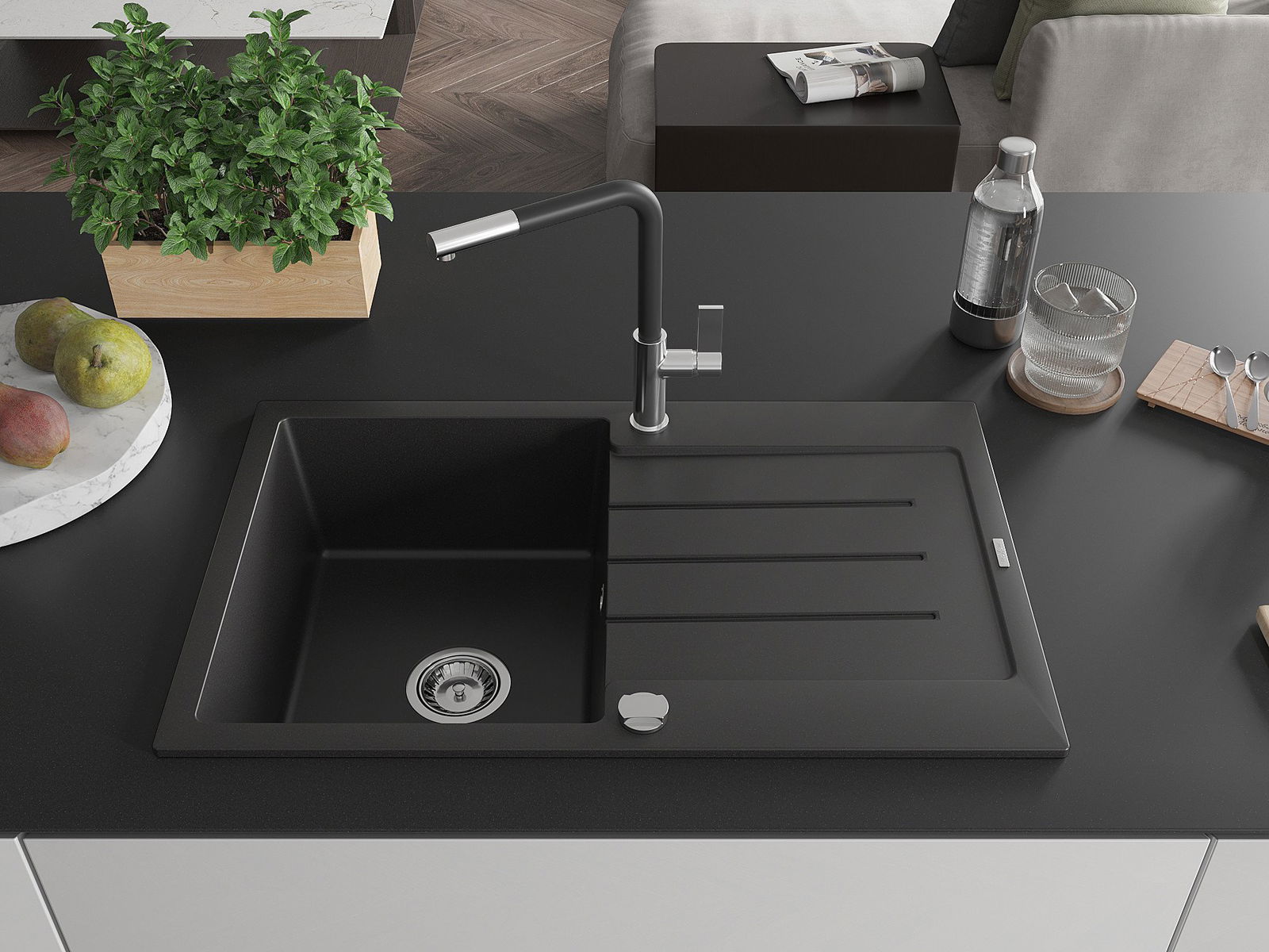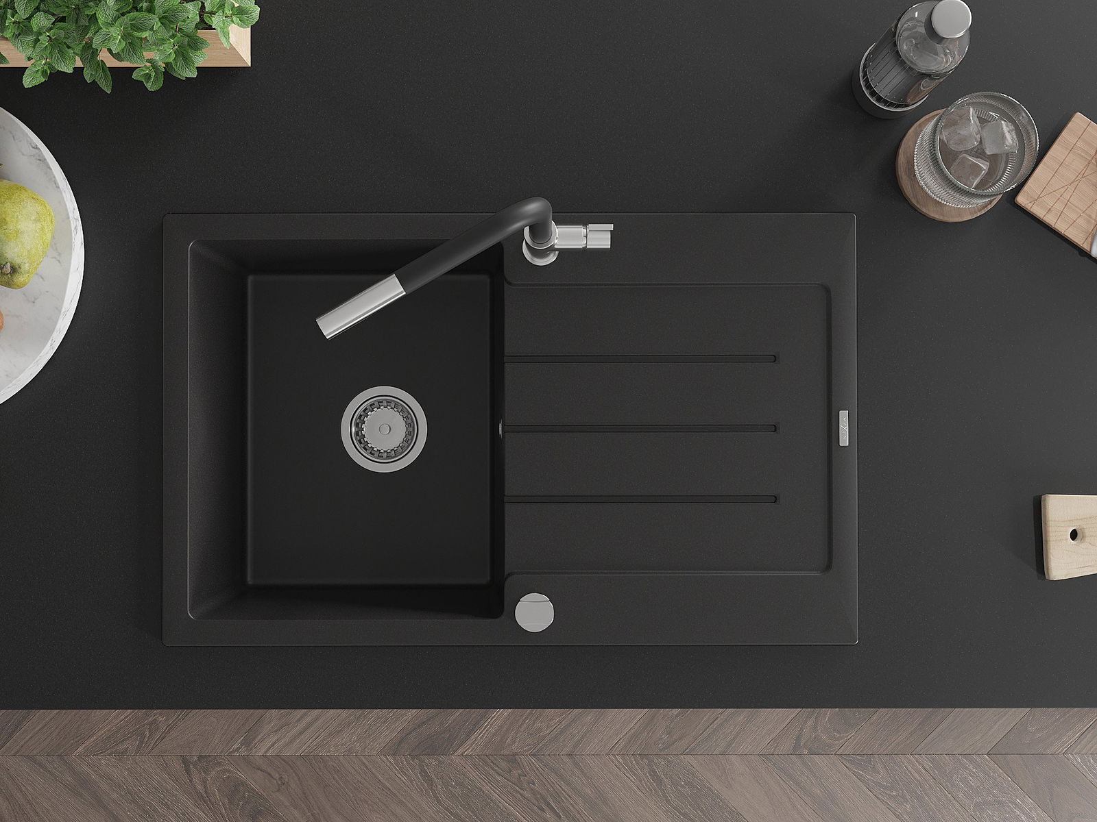Mexen Bruno 1-bowl granite sink with drainer and Flora kitchen tap, black - 6513-77-670401-07
