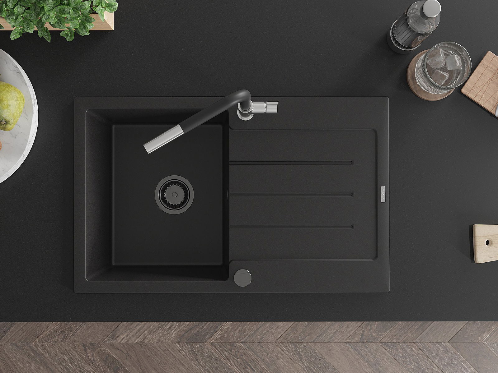 Mexen Bruno 1-bowl granite sink with drainer and Flora kitchen tap, black - 6513-77-670401-07-B