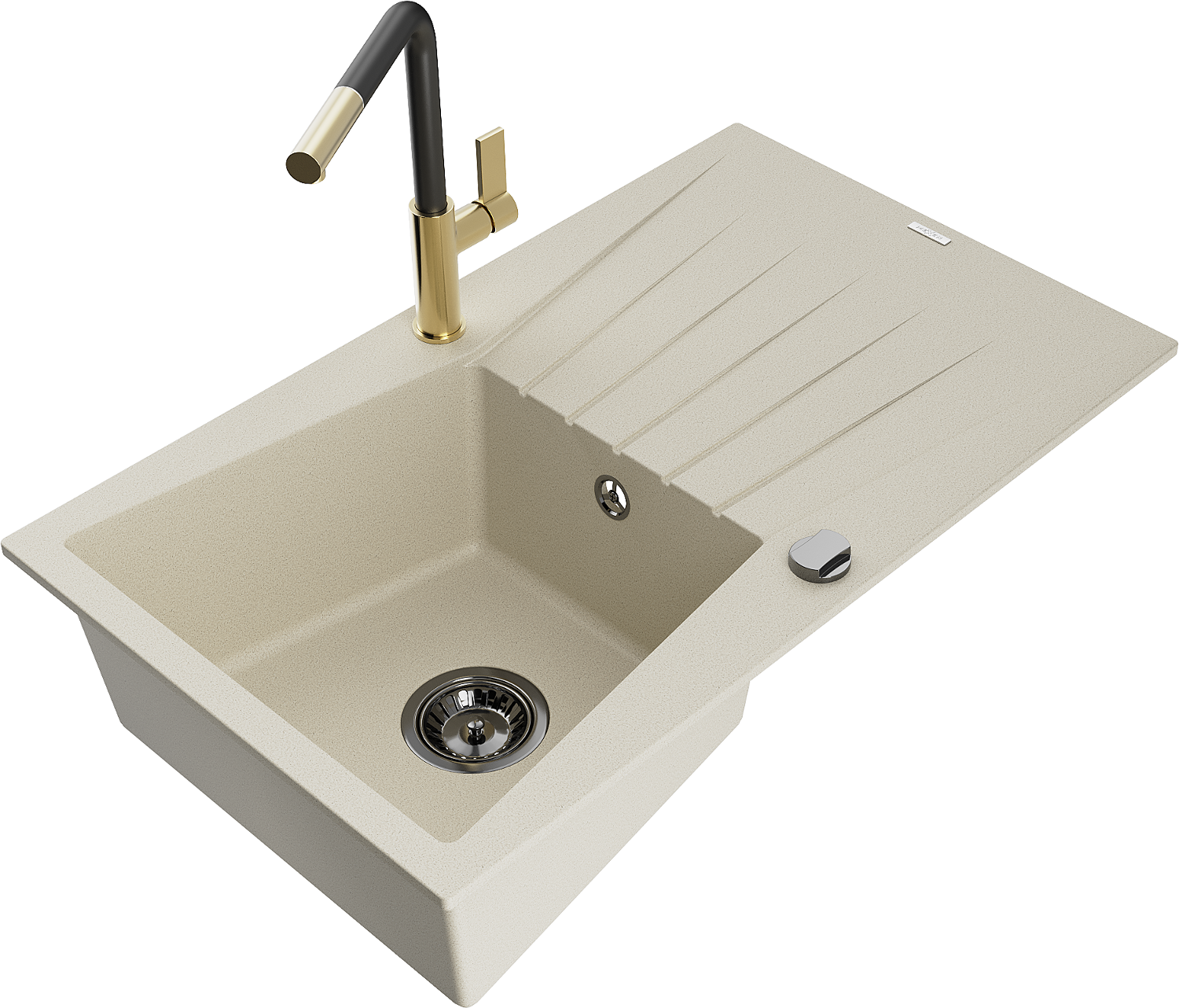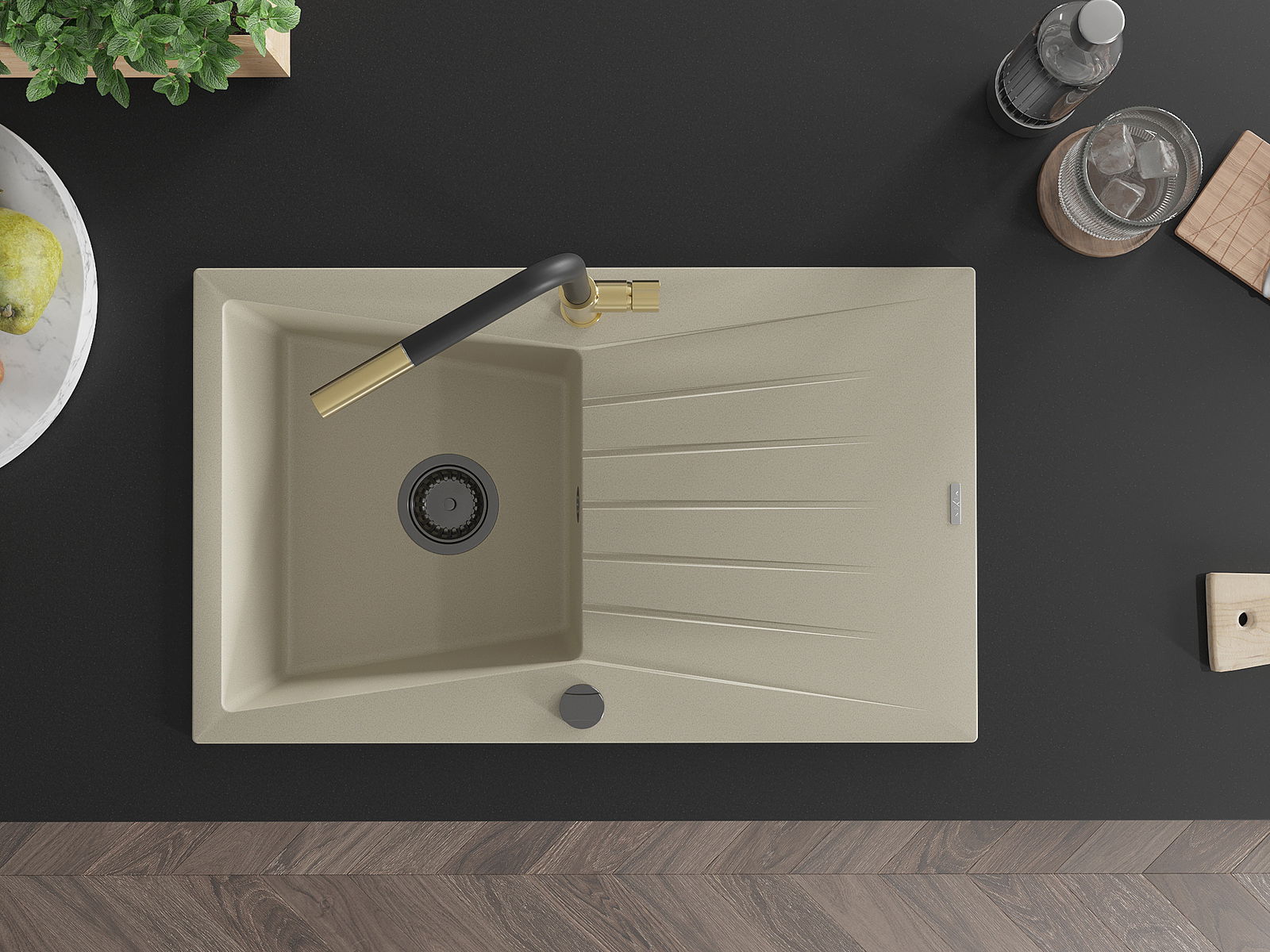 Mexen Cesar granite sink single bowl with drainer and Flora kitchen tap, beige - 6514-69-670401-57-B