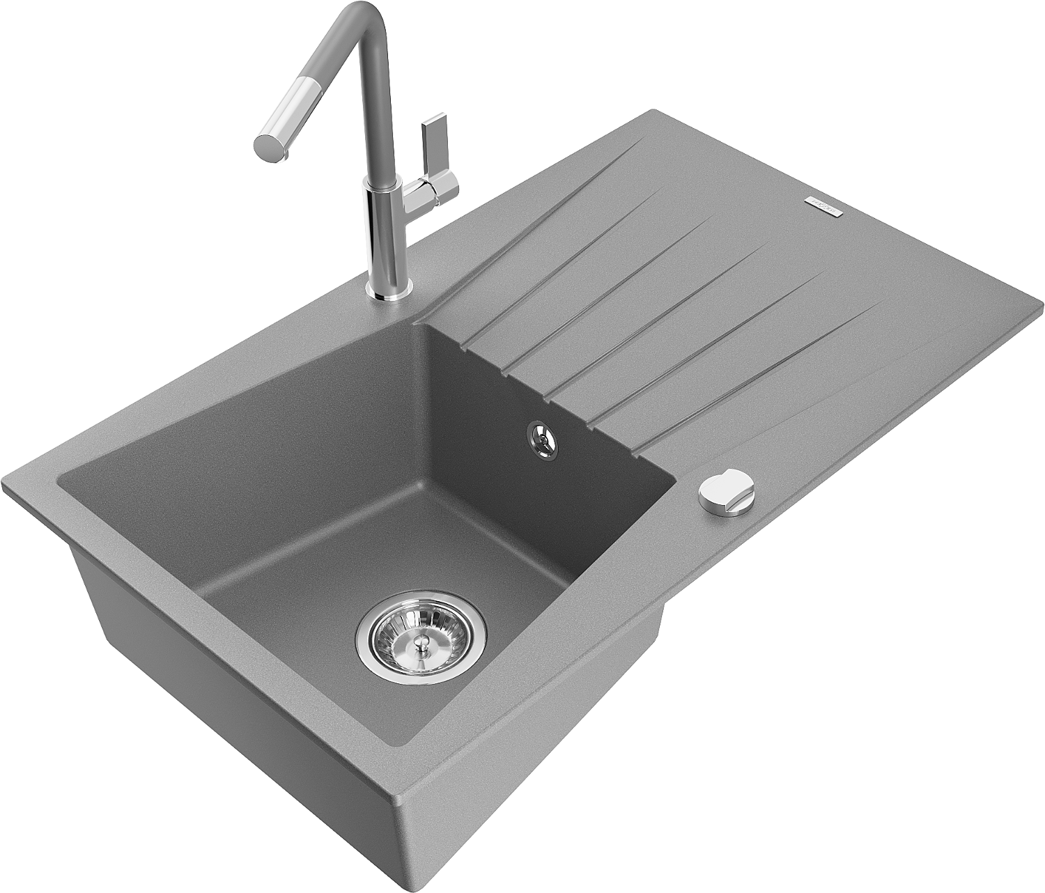 Mexen Cesar granite sink single-bowl with drainer and Flora kitchen tap, grey - 6514-71-670401-06