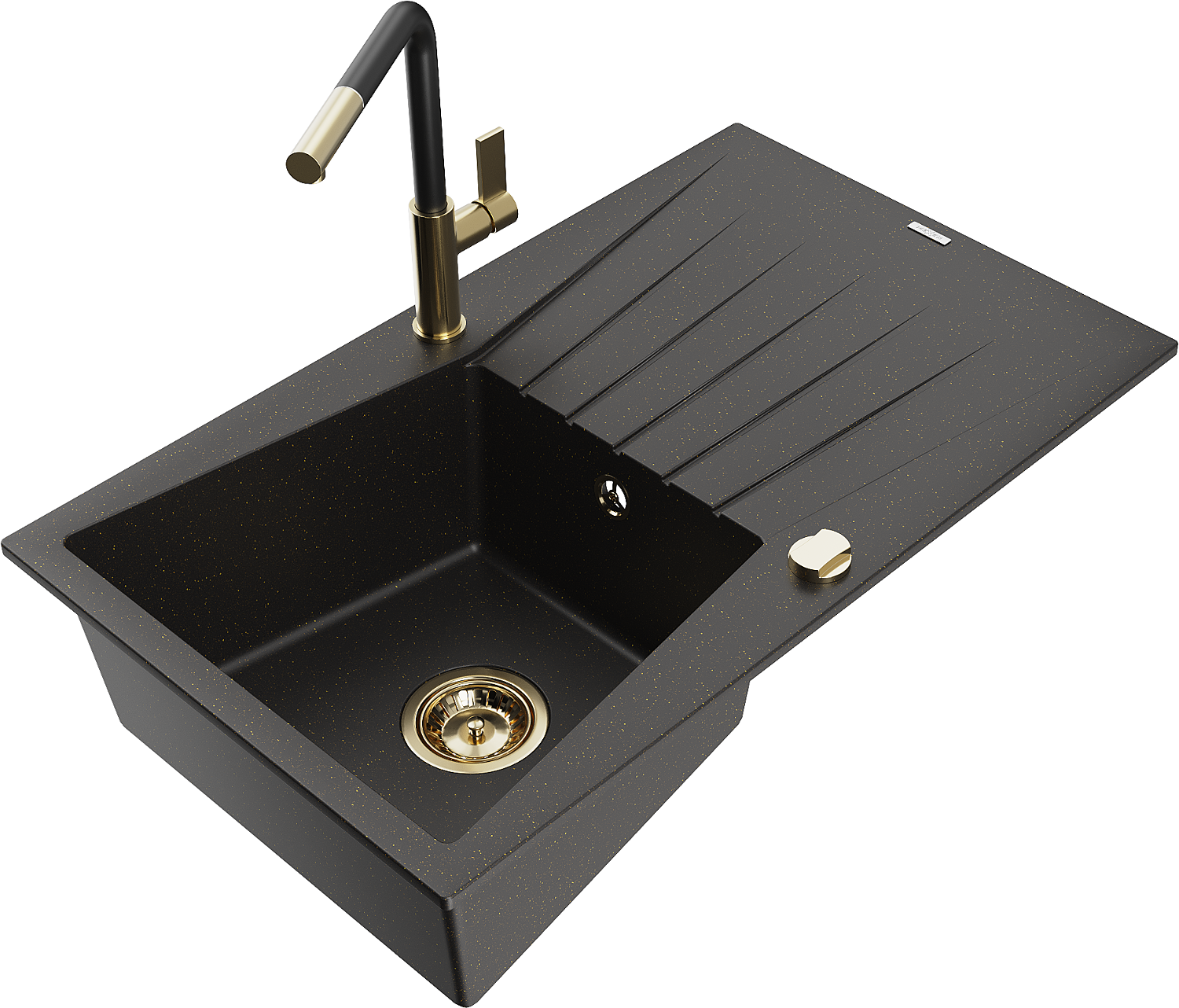Mexen Cesar granite sink 1-bowl with drainer and Flora kitchen tap, black/gold metallic - 6514-75-670401-57-G