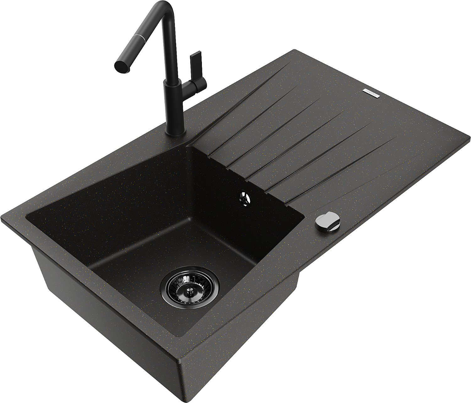 Mexen Cesar granite sink 1-bowl with drainer and Flora kitchen tap, black/gold metallic - 6514-75-670401-70-B