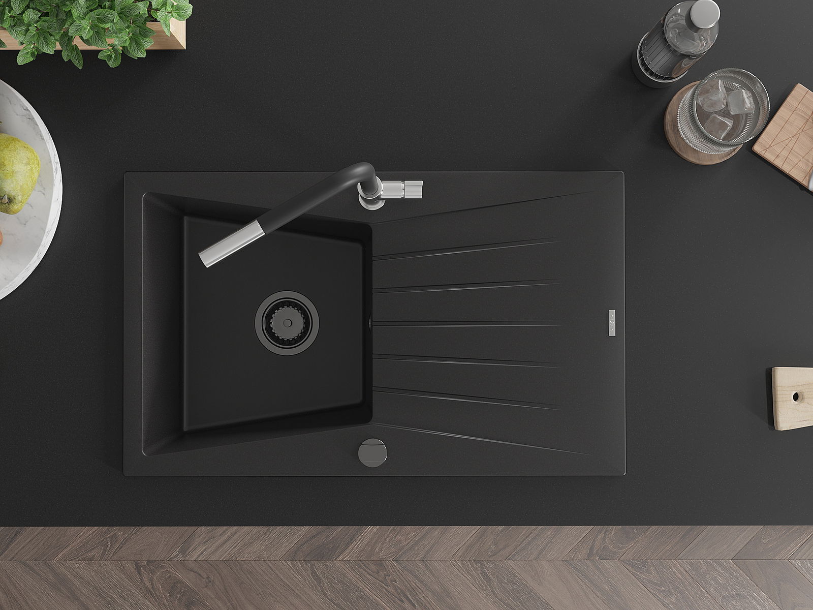 Mexen Cesar granite sink 1-bowl with drainer and Flora kitchen tap, black - 6514-77-670401-07-B