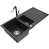 Mexen Andres granite sink 1.5-bowl with drainer and Flora kitchen tap, black/silver - 6515-73-670401-07