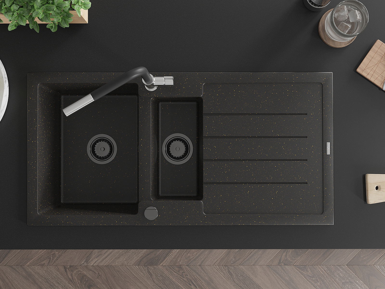 Mexen Andres granite sink 1.5-bowl with drainer and Flora kitchen tap, black/gold - 6515-75-670401-07-B