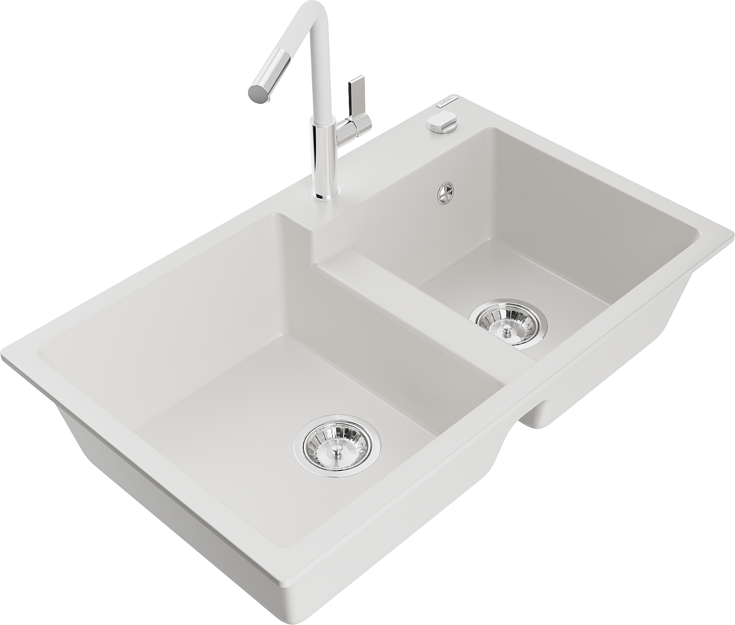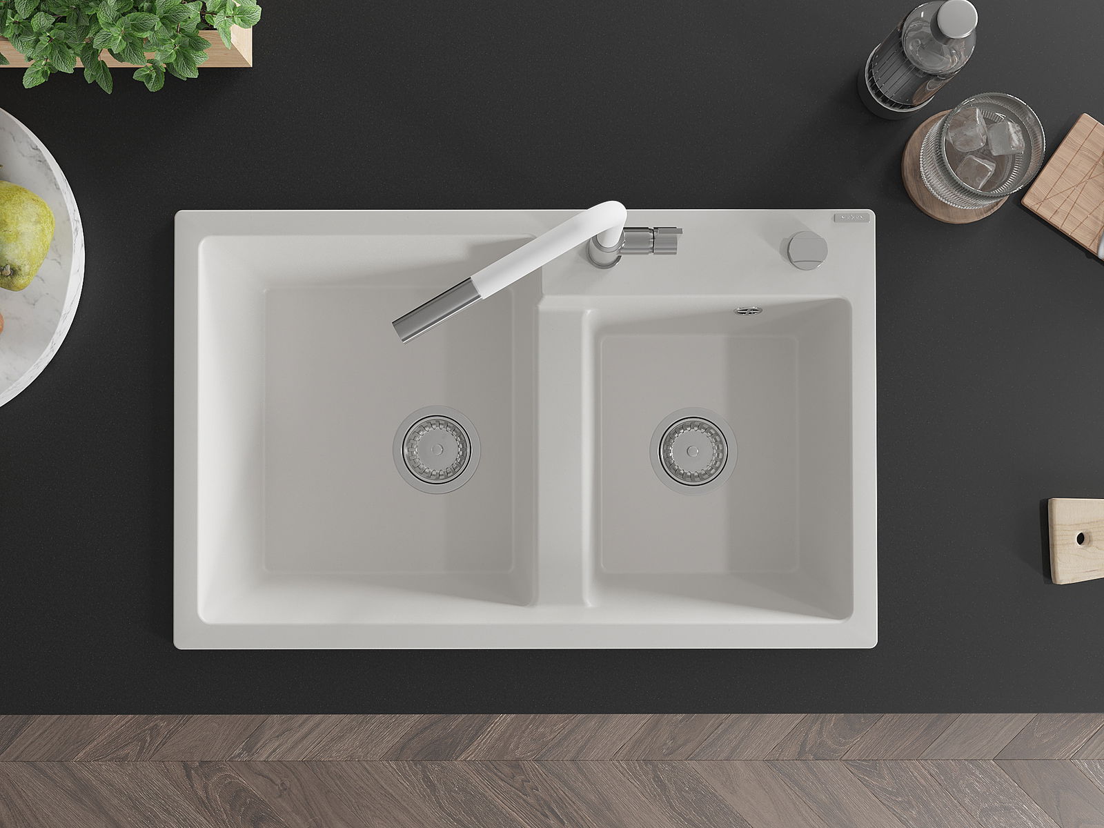 Mexen Tomas granite sink with 2 bowls and Flora kitchen tap, white - 6516-20-670401-02