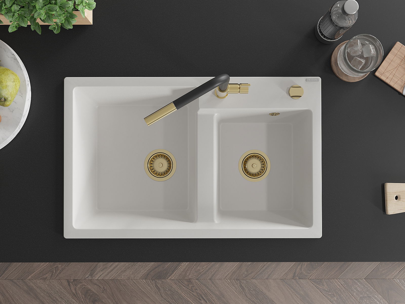 Mexen Tomas granite sink 2-bowl with Flora kitchen tap, white - 6516-20-670401-57-G