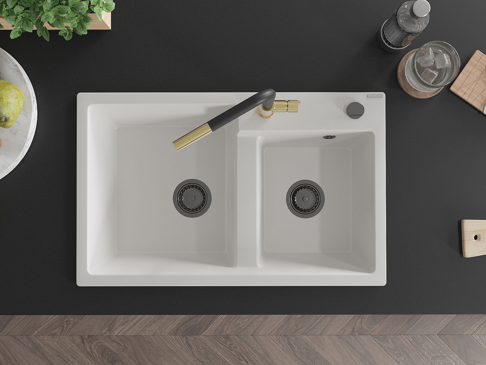 Mexen Tomas granite sink 2-chamber with Flora kitchen tap, white - 6516-20-670401-57-B