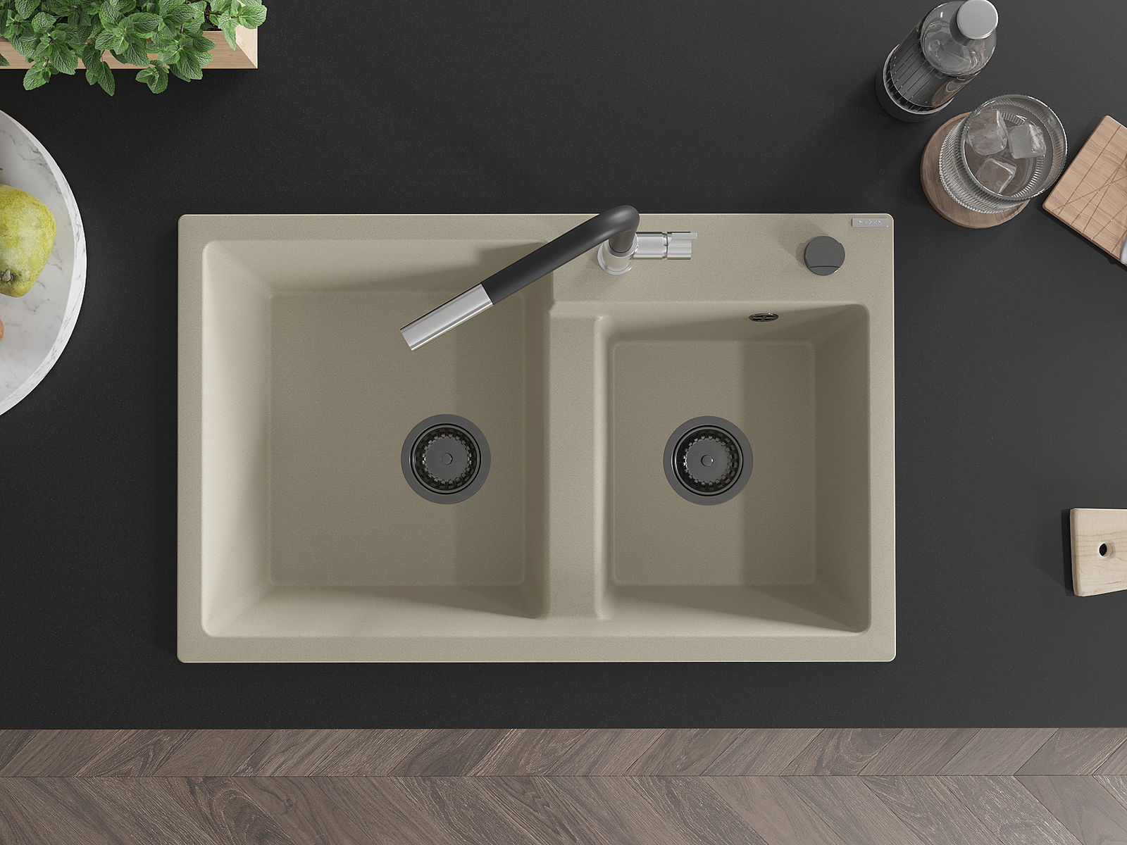 Mexen Tomas granite sink with 2 bowls and Flora kitchen tap, beige - 6516-69-670401-07-B