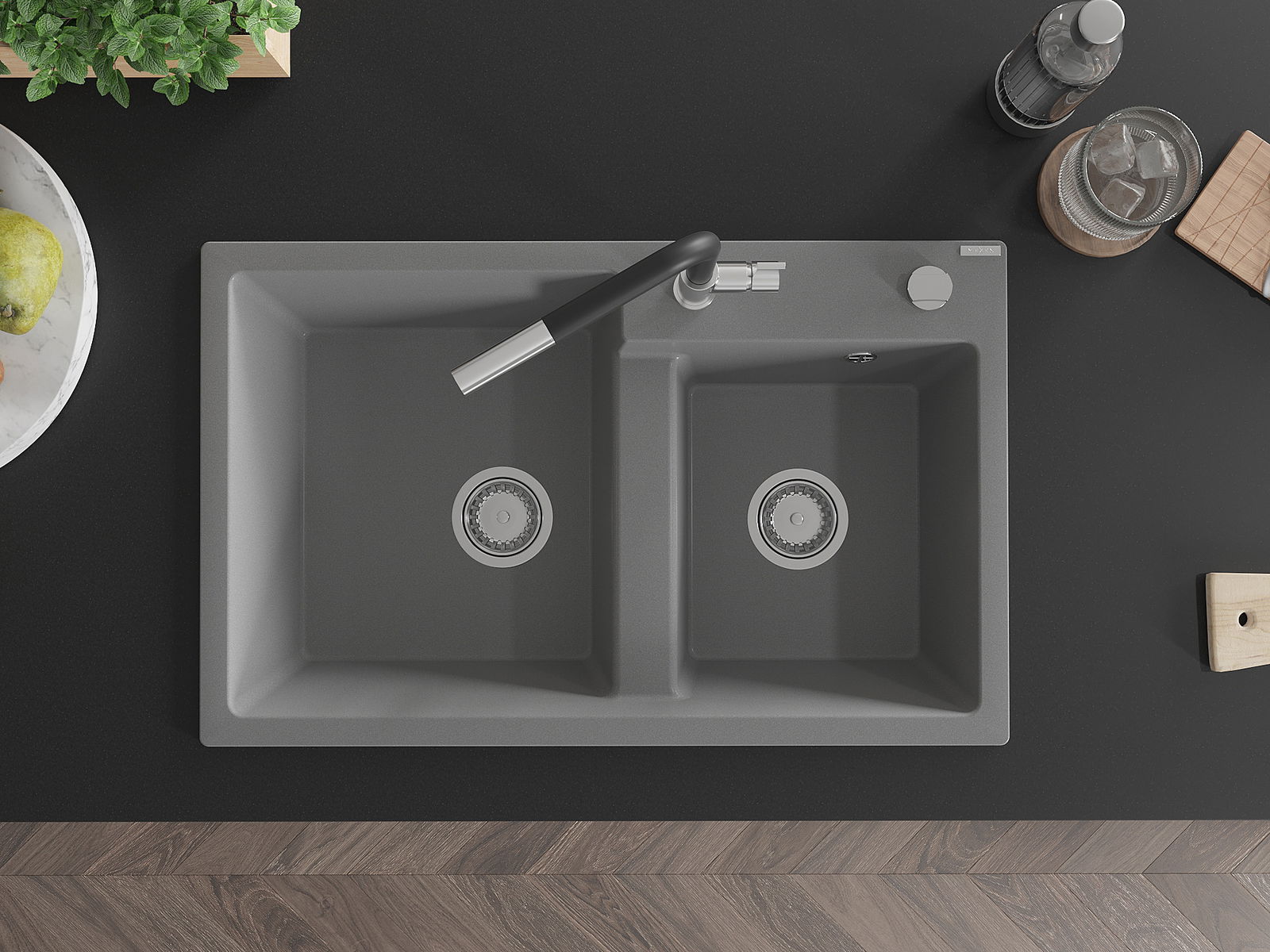 Mexen Tomas granite kitchen sink with 2 bowls and Flora kitchen tap, grey - 6516-71-670401-07
