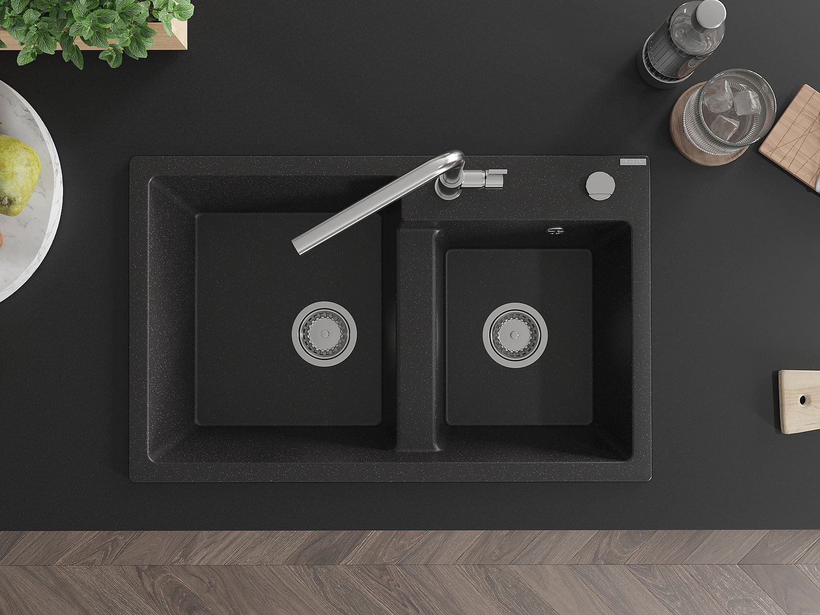 Mexen Tomas granite sink, 2-compartment, with Flora kitchen faucet, black/silver metallic - 6516-73-670401-00