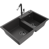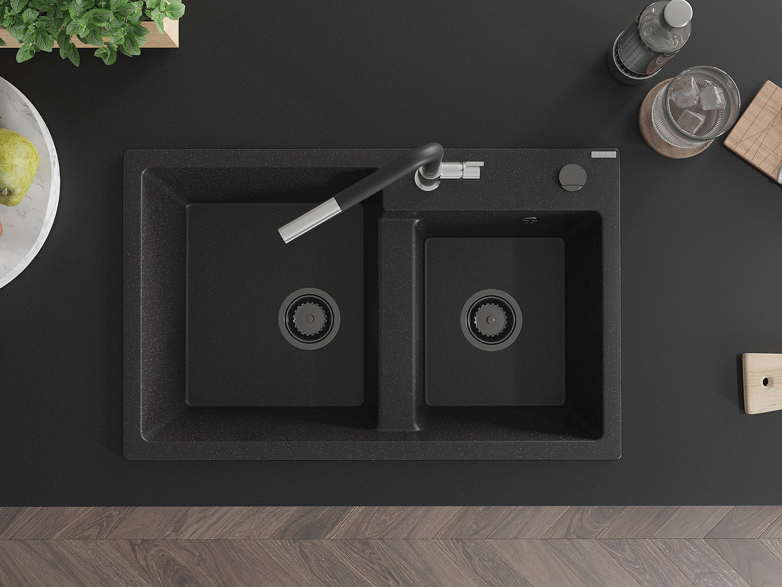 Mexen Tomas Granite 2-Bowl Sink with Flora Kitchen Tap, Black/Silver Metallic - 6516-73-670401-07-B