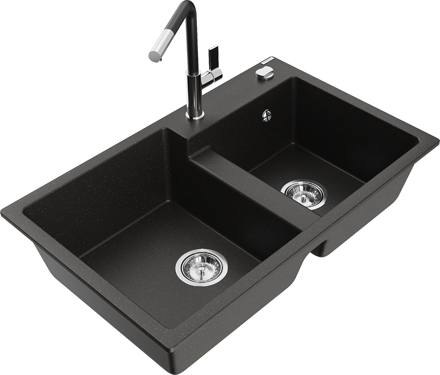 Mexen Tomas granite sink 2-bowl with kitchen tap Flora, black/golden metallic - 6516-75-670401-07